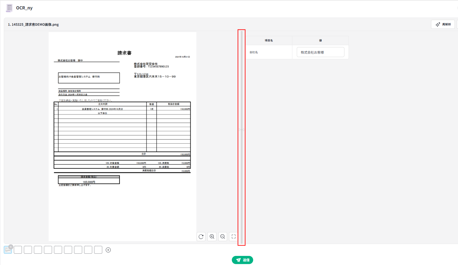 赤枠で囲んだ画像表示エリアとOCR結果表示エリアの境界線上にカーソルをのせ、左右にドラッグすることで表示幅を変更できます。