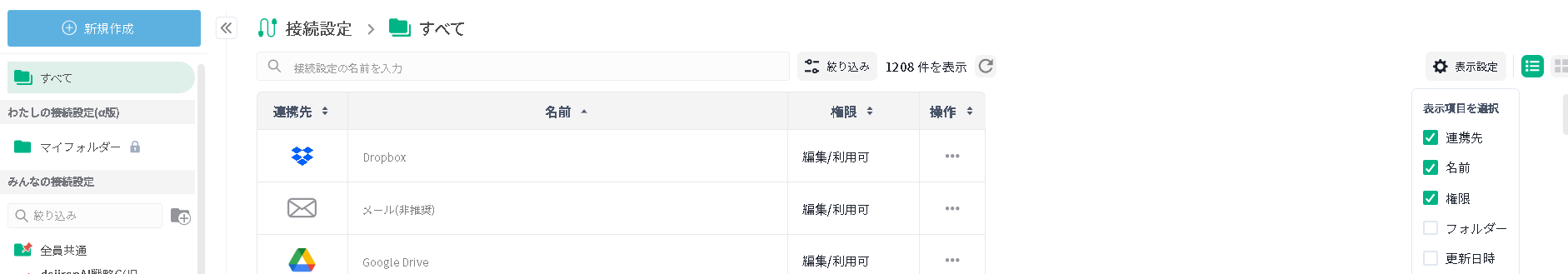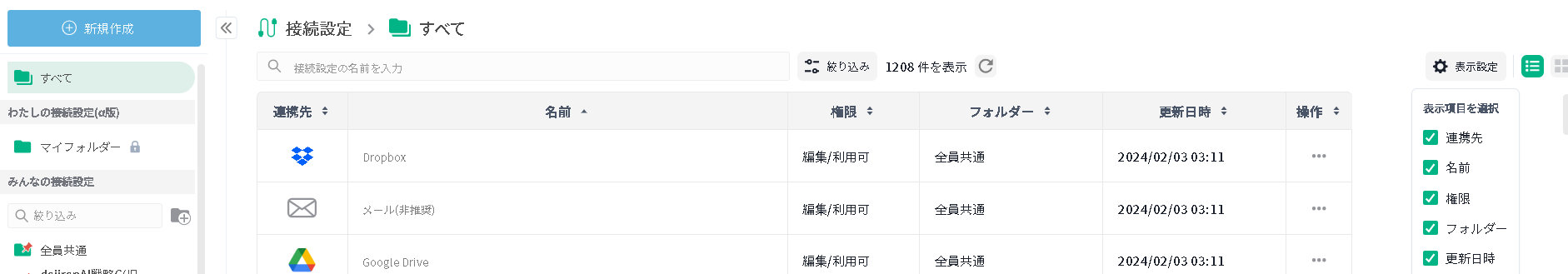 接続設定の一覧画面で表示列のカスタマイズ機能を追加しました