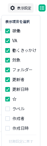 以下の一覧画面で、表示する列のON/OFFを切り替えられるようになりました。