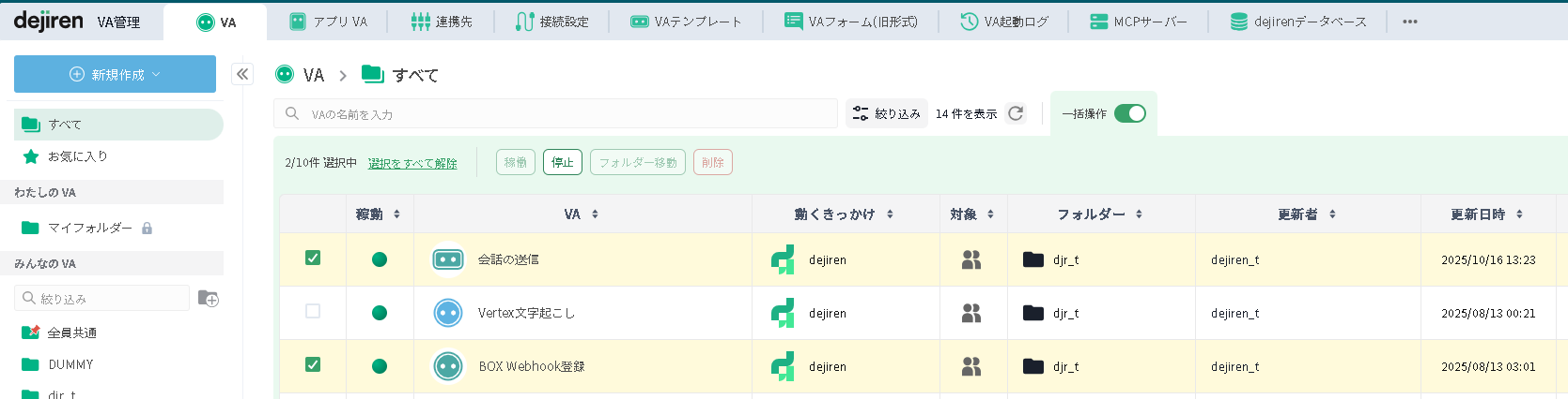 VA一覧・アプリVA一覧・エージェントVA一覧で一括操作機能を追加しました