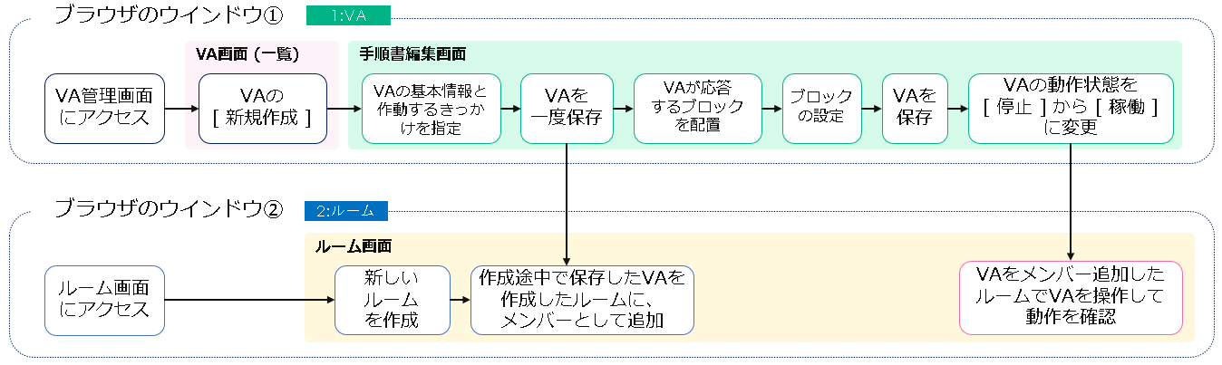 Web ブラウザで、VA 管理画面と dejiren ルーム画面を行き来して設定作業を行います。