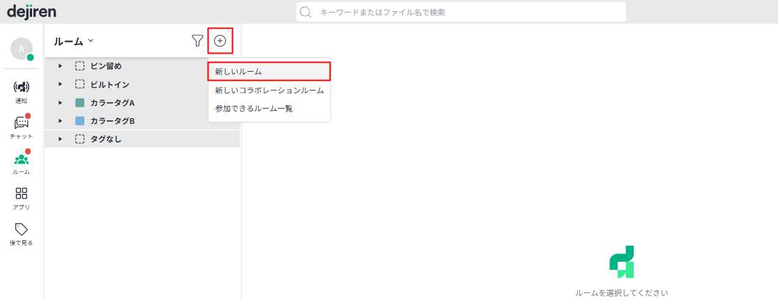 13. ルーム画面に移動して、 [+] をクリックして「新しいルーム」を選択します。