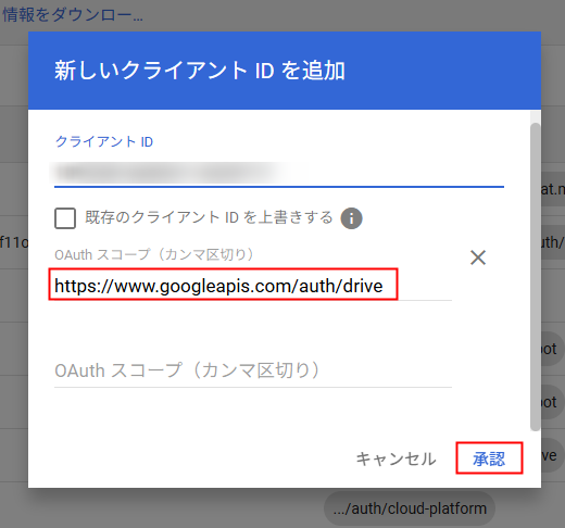 5. [OAuthスコープ]に以下のカンマ区切りテキストをコピーして貼り付け、[承認]をクリックします。https://www.googleapis.com/auth/userinfo.email,https://www.googleapis.com/auth/userinfo.profile