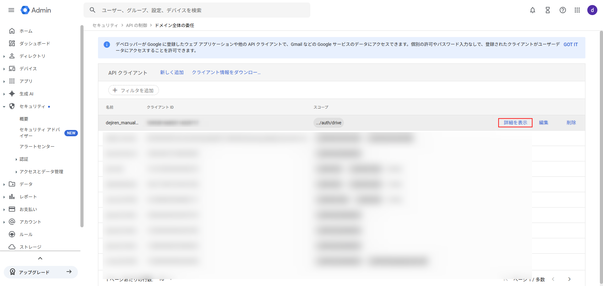 6. API クライアントの一覧にアクセス権を設定したOAuthクライアントIDが追加されるので、[詳細を表示]をクリックします。
