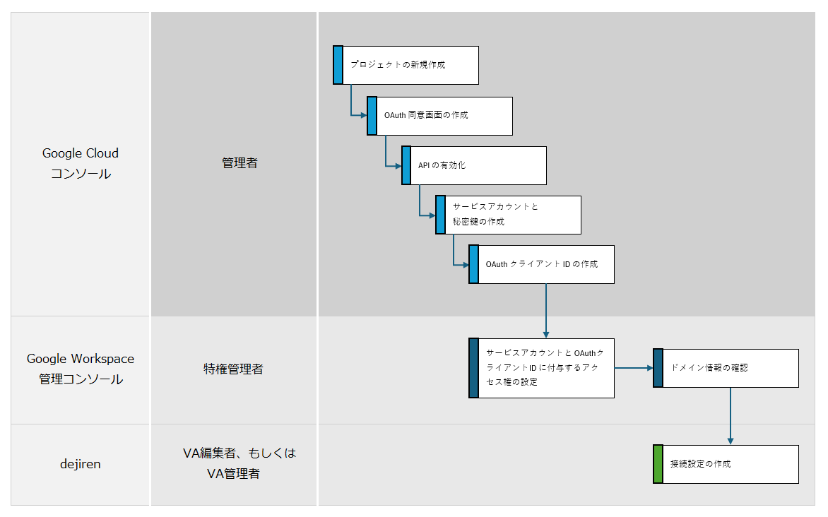 Google Cloud コンソール | 管理者 | プロジェクトの作成 OAuth同意画面の作成 APIの有効化 サービスアカウントの作成 OAuthクライアントの作成 |