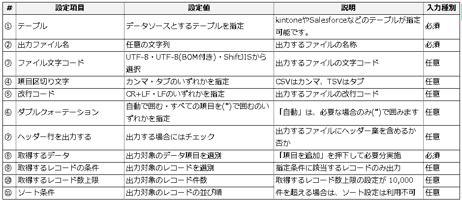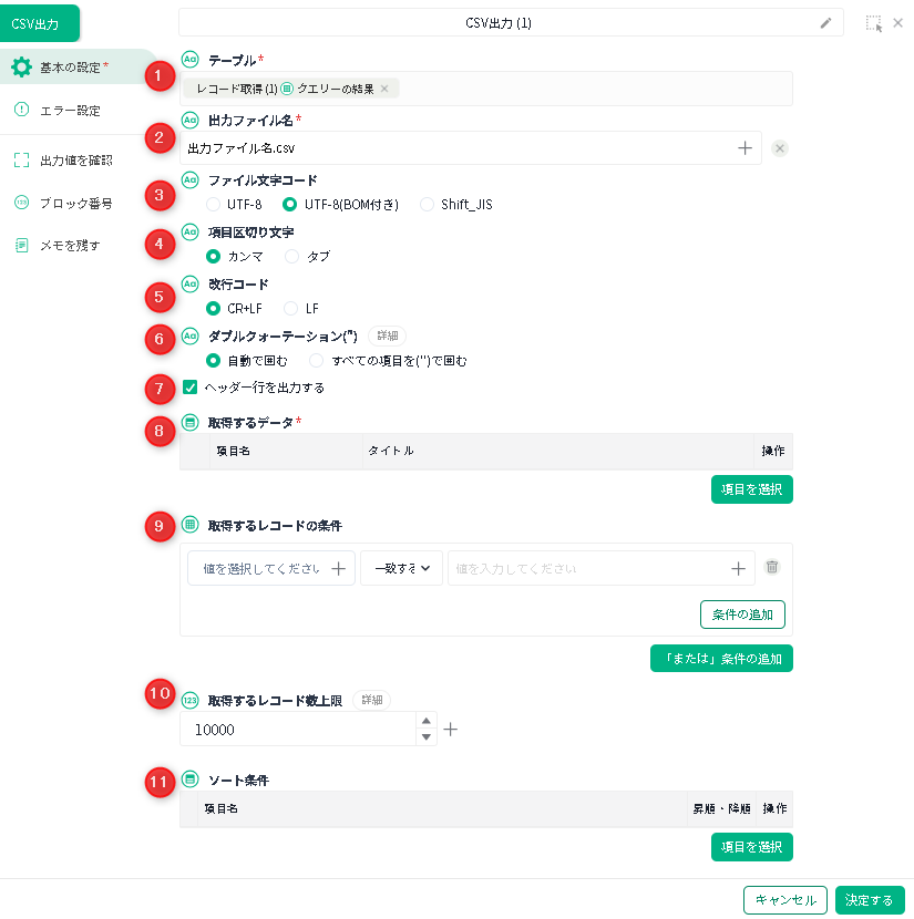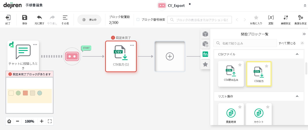 2026.01.06 CSV出力ブロックについて 外部から取得、または生成したテーブル型データをCSVファイルとして出力することができます。 ブロックは、[関数ブロック一覧] > [CSVファイル]グループにあります。※ [高度な手順ブロック一覧] > [dejirenデータベース]グループにある [CSV出力]とは異なります。 ブロックの設定項目 前の説明 一覧に戻る 次の説明