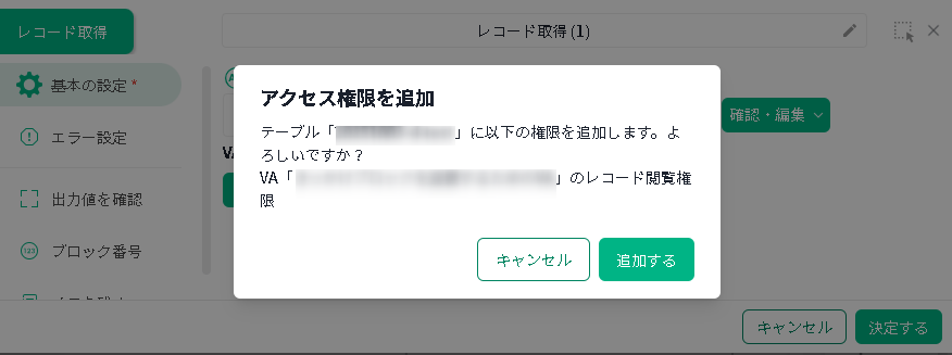 - 手順書ブロック編集画面でアクセス権を与えられていないテーブルを選択した場合は、