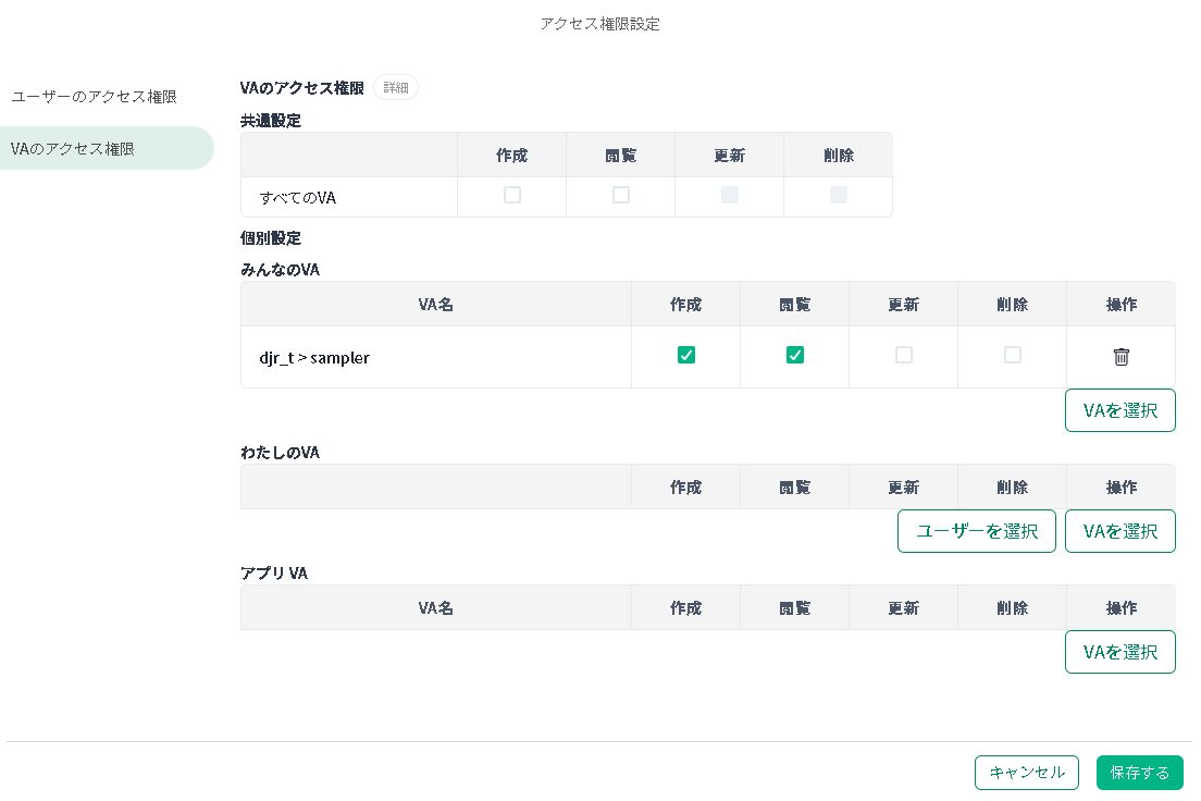 すべてのVAに対して、作成、閲覧、更新、削除のアクセス権限を付与します。