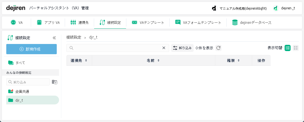 dejiren | VA編集者ロール、もしくはVA管理者ロールに所属するユーザー | 接続設定の新規作成 |