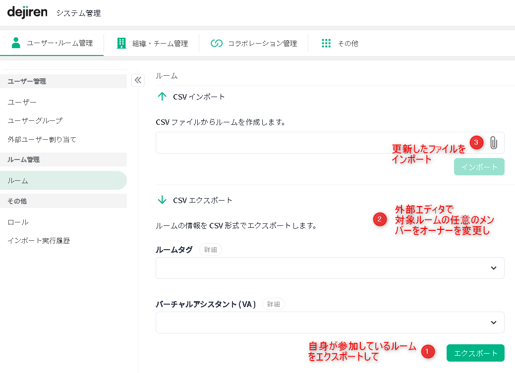 - 対象ルームのメンバー且つ「システム管理者」ロールに所属するユーザーであれば、