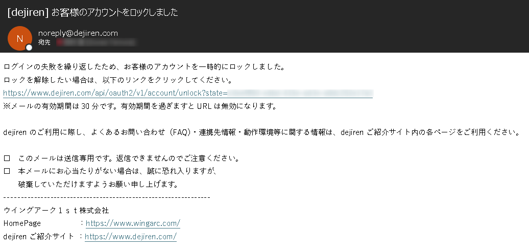 ロック状態を解除するためのリンクが記されたメールが、ユーザーのメールアドレスに送信されます。