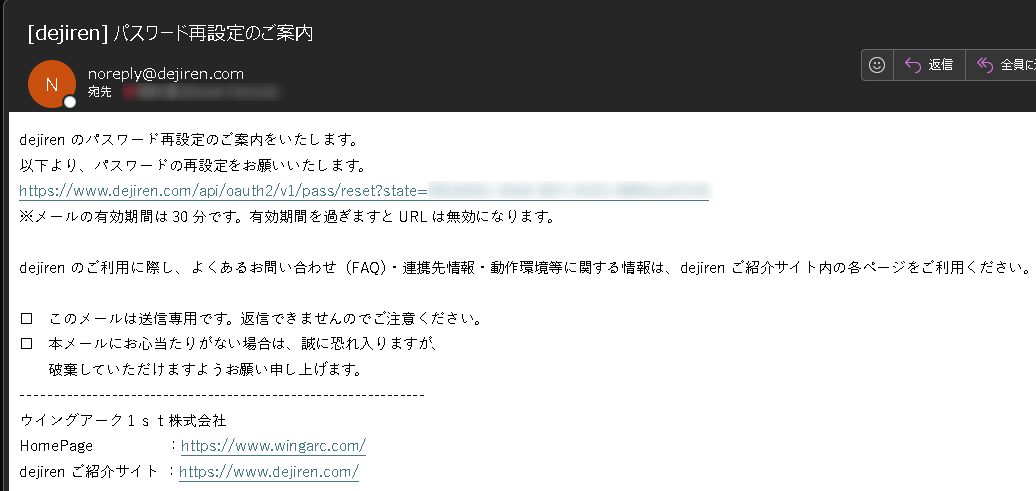 パスワード再設定のリンクメッセージが登録メールアドレスに送信されます。