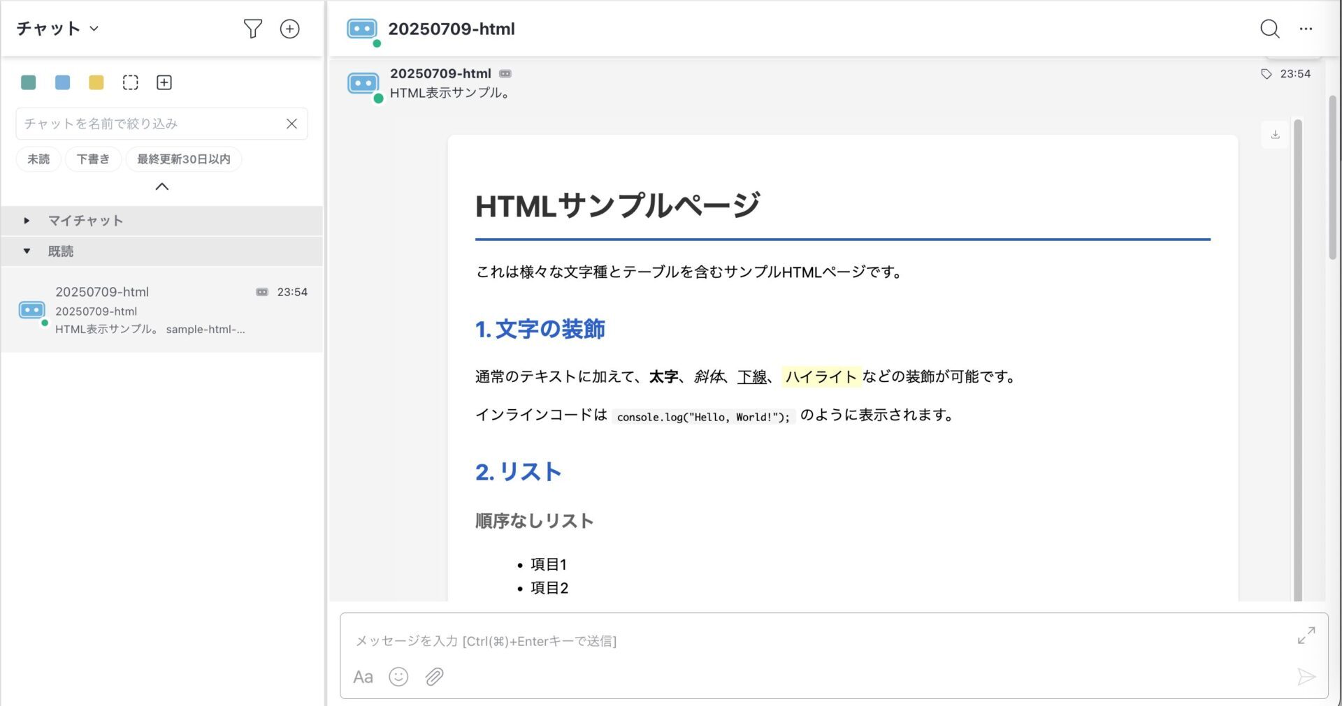 チャットメッセージ画面で、ファイルとしてではなく、HTMLファイルの内容を直接表示することができます。