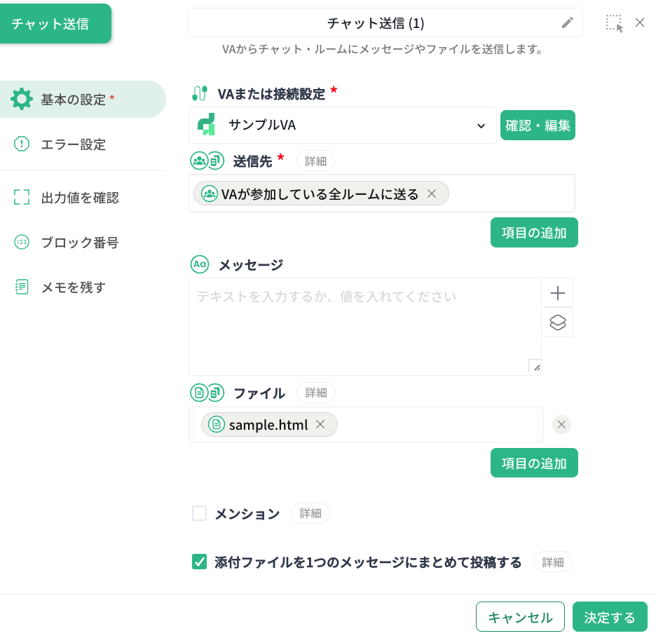 特定の操作(メッセージ送信、ファイル投稿、VAアクションによる定型文の送信、VAフォーム)を行いますが、