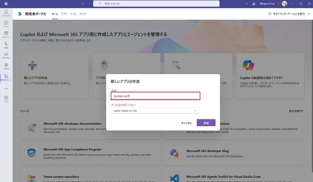2.新しいアプリの作成で名前に任意の名称を文字入力して、マニフェストのバージョンはLatest Stableを選択し、作成をクリックします。