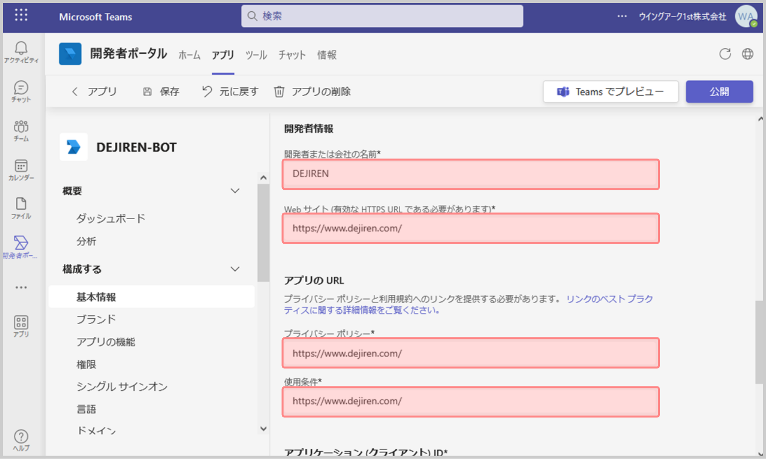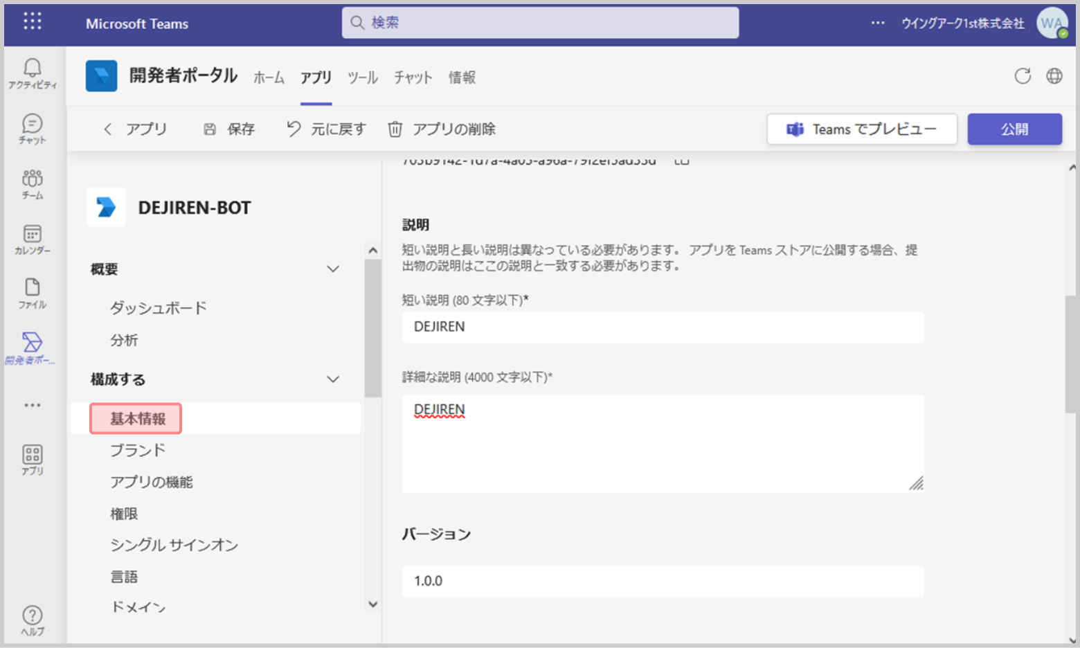 3.作成したアプリのサイドメニューにある[基本情報]をクリックします。