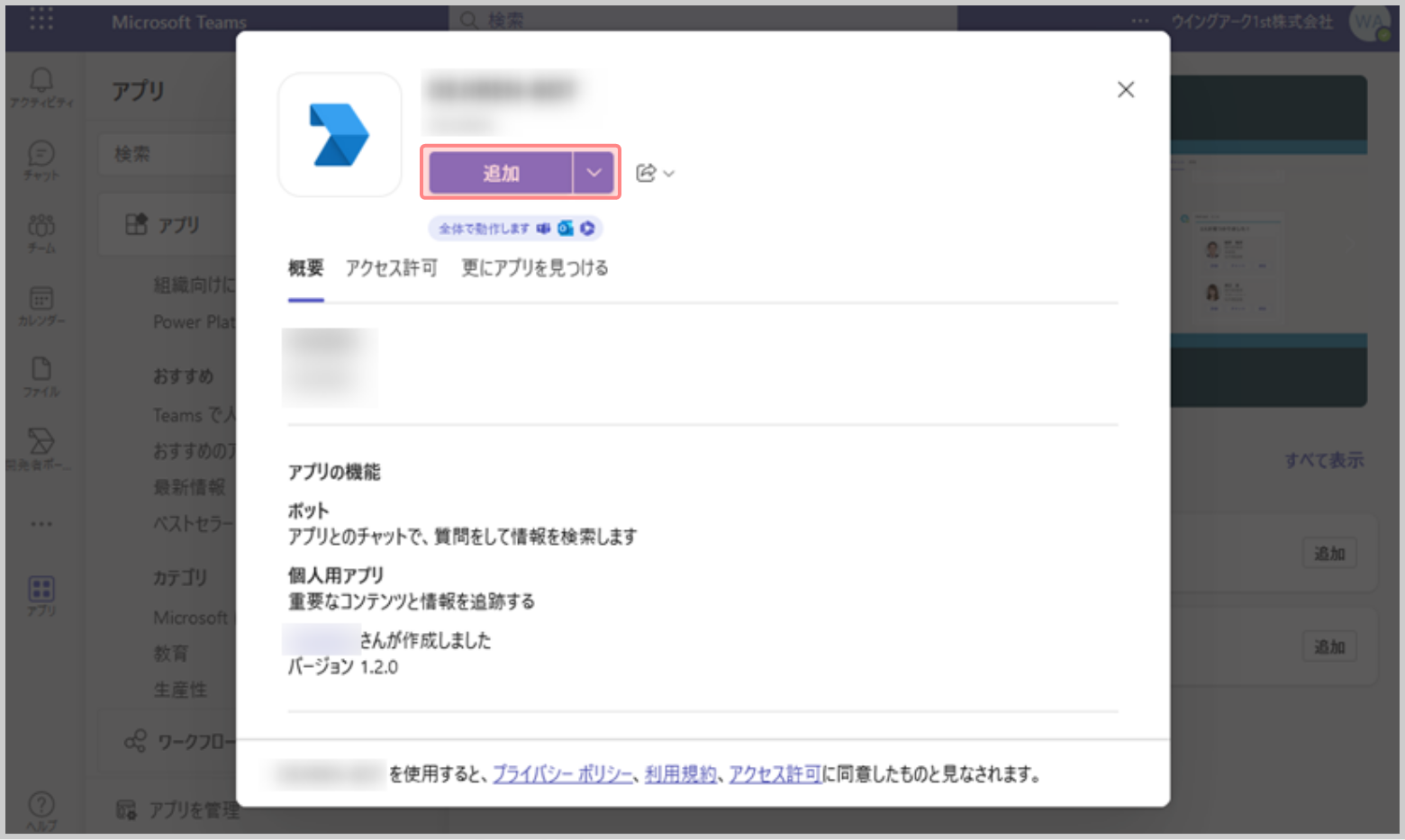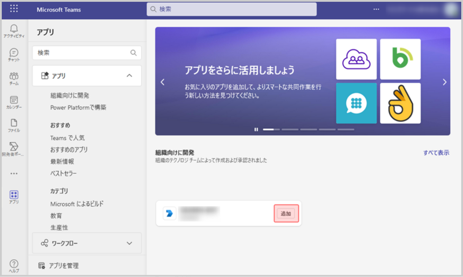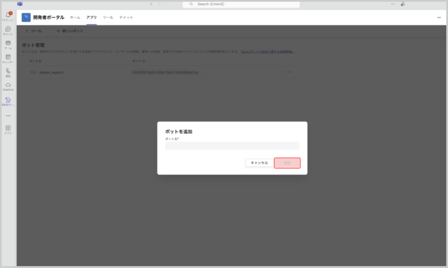 2.[アプリ]で、作成したボットの[追加]をクリックします。
