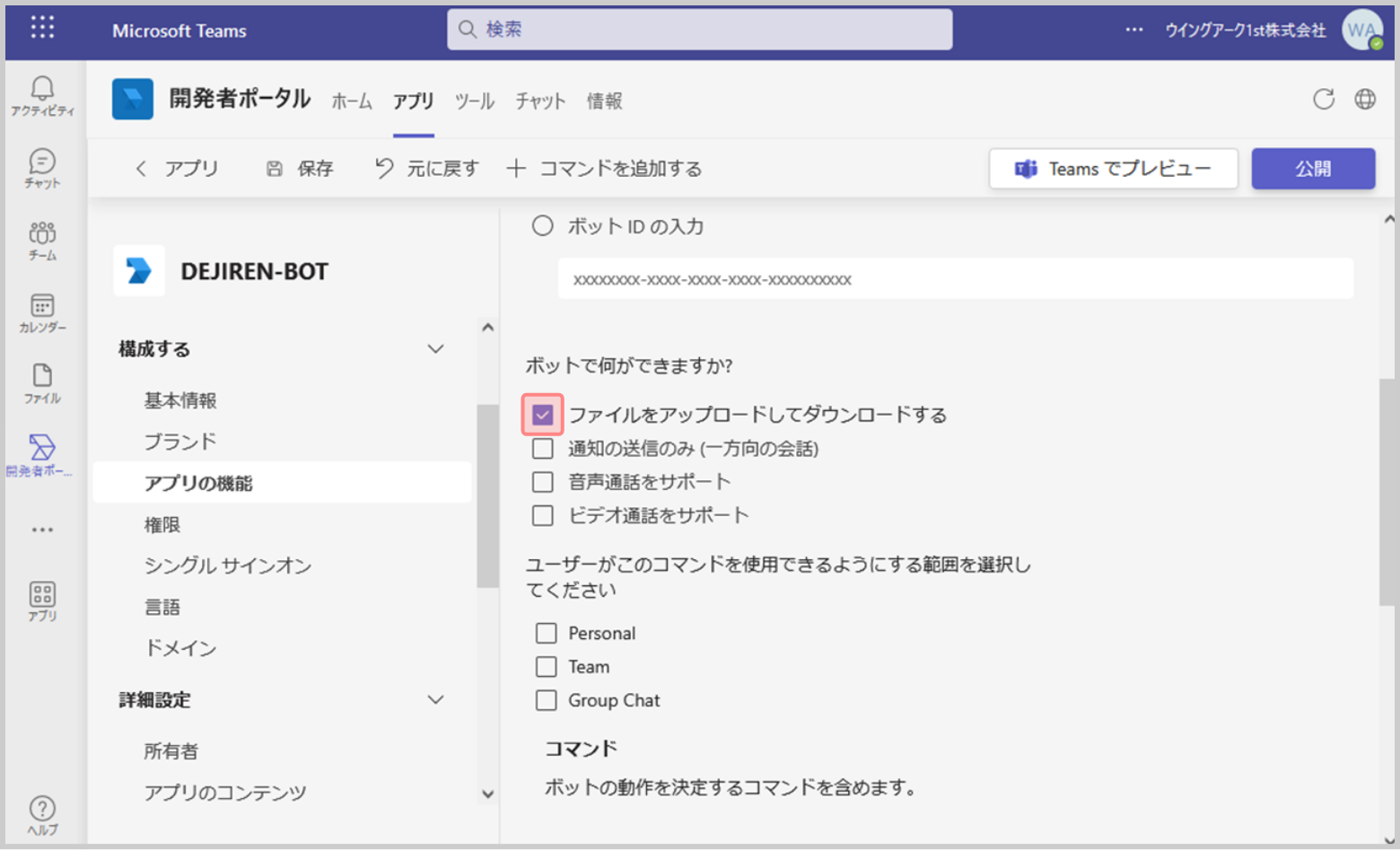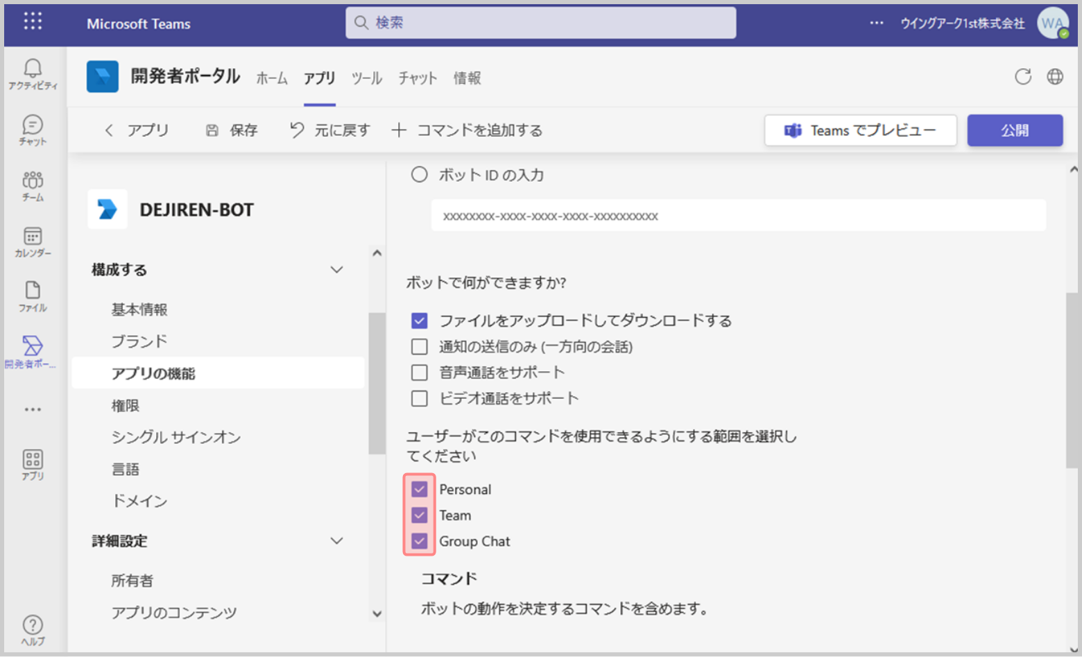 17.[ユーザーがこのコマンドを使用できるようにする範囲]で[Personal]、[Teams]、[Group Chat]にチェックし、[保存]をクリックします。