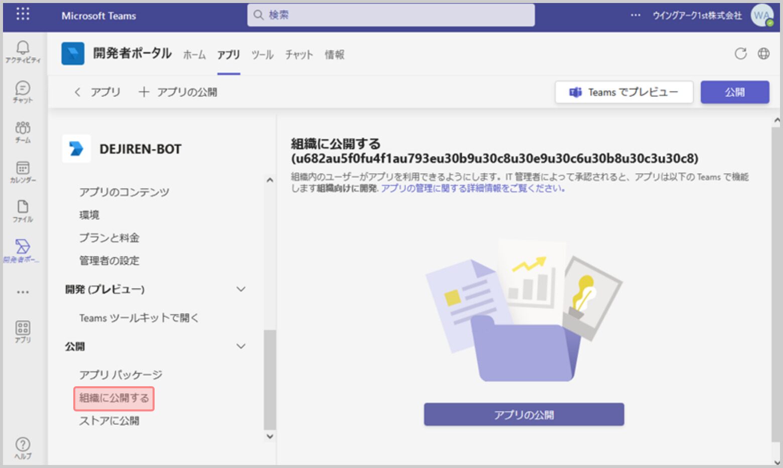 1.開発者ポータルのサイドメニューの[公開]にある[組織に公開する]をクリックします。
