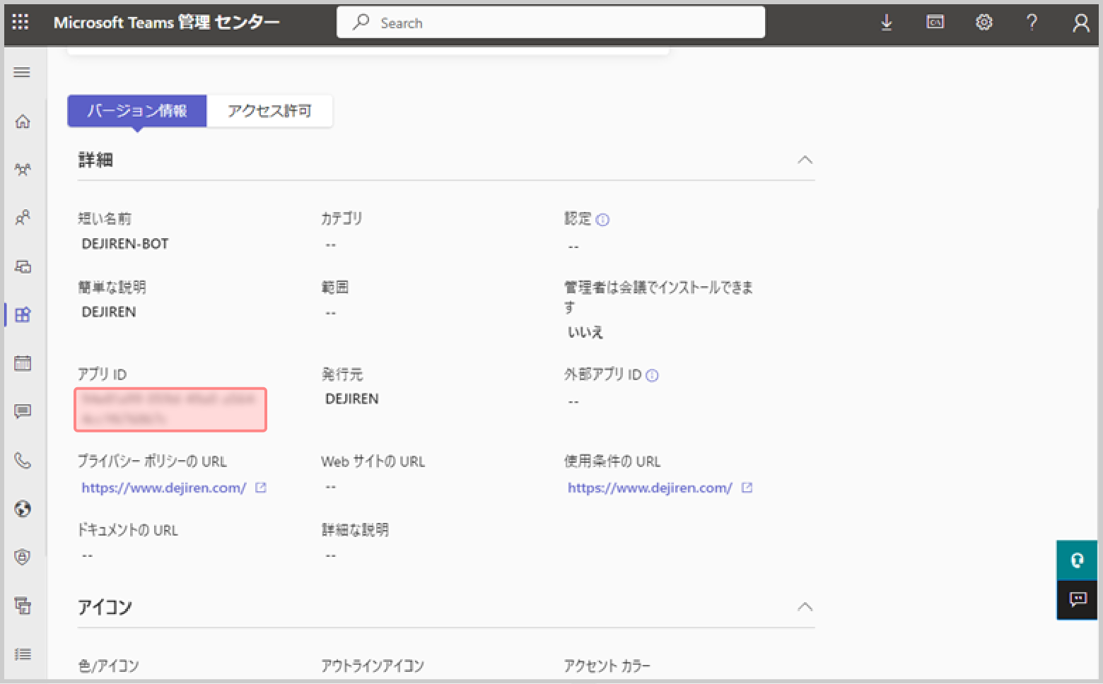 | アプリID | [MicrosoftTeams管理センター] – [About] – [App ID]の文字列を転記します。 | 手順3-6 |