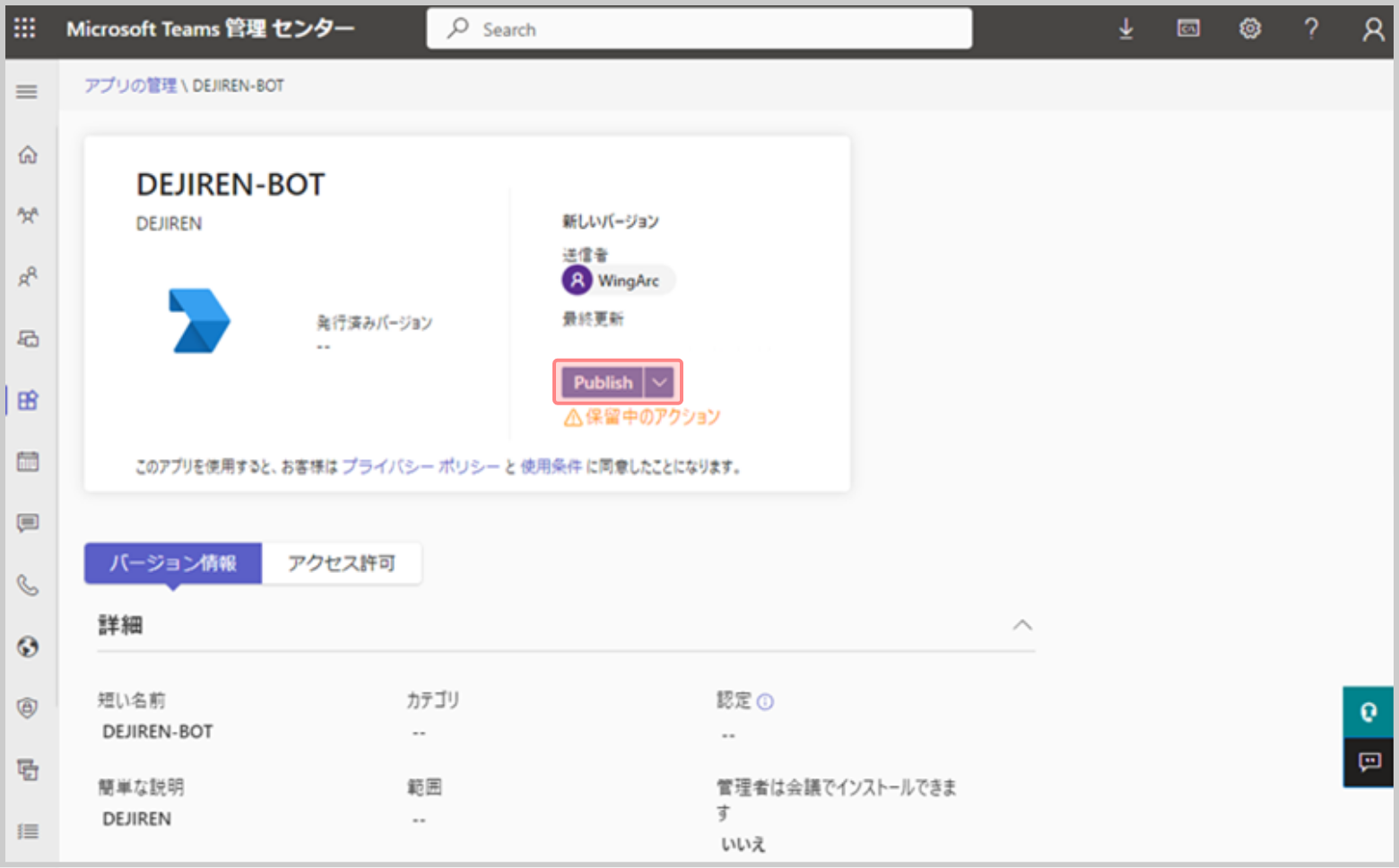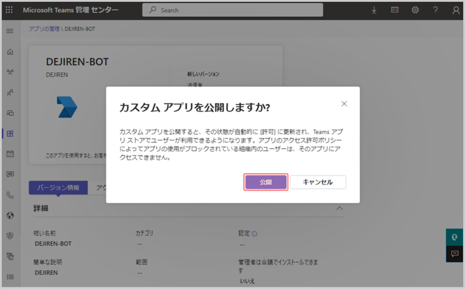 手順3.Microsoft Teams 管理 センターで、作成したBotアプリの公開承認を行う