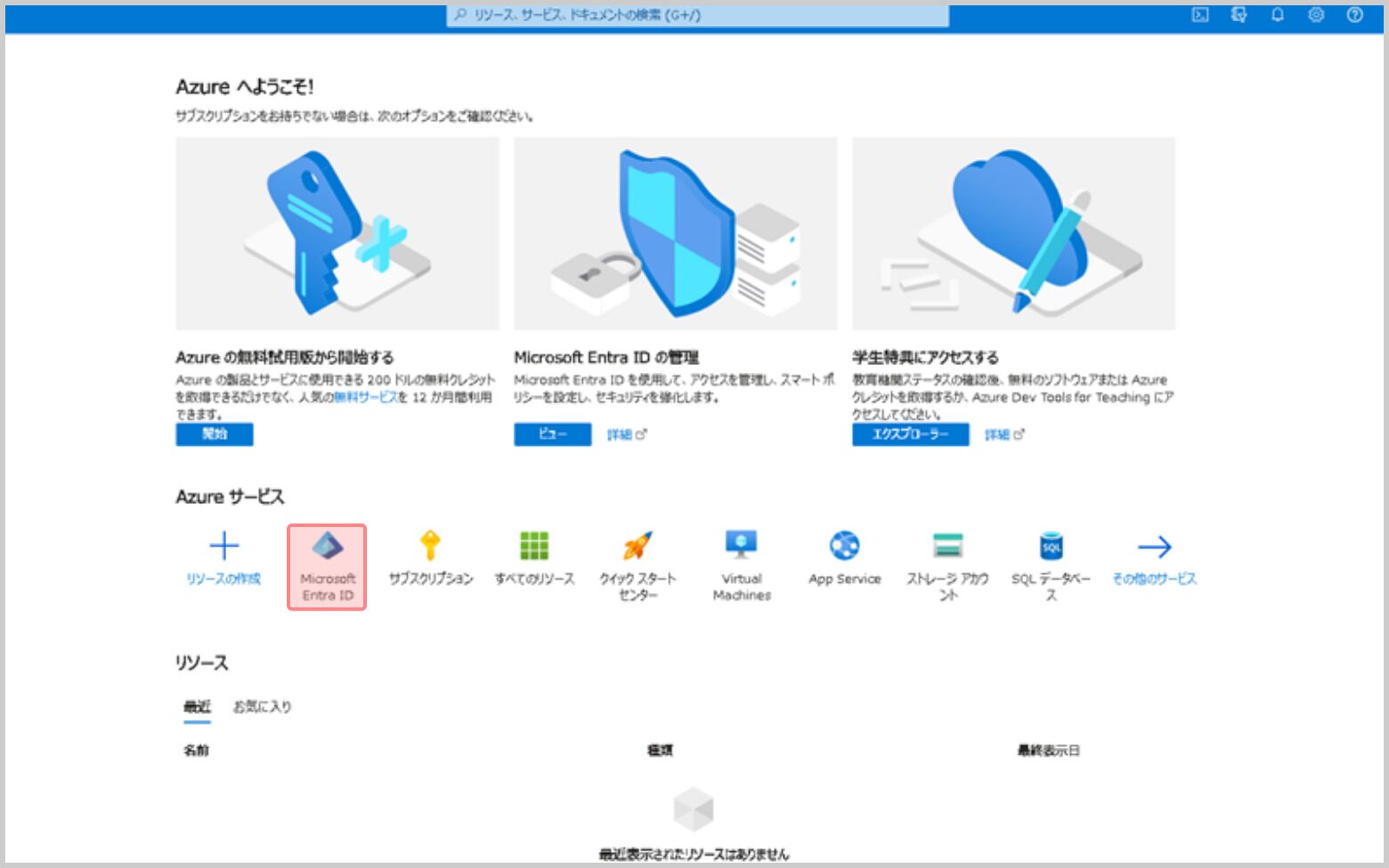 2.Microsoft Azure ポータルの[Microsoft Entra ID] をクリックします。