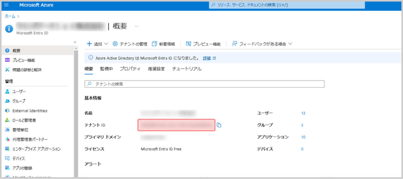 3.Entra ID の[概要]にある[テナントID]の表示文字列を控えます。