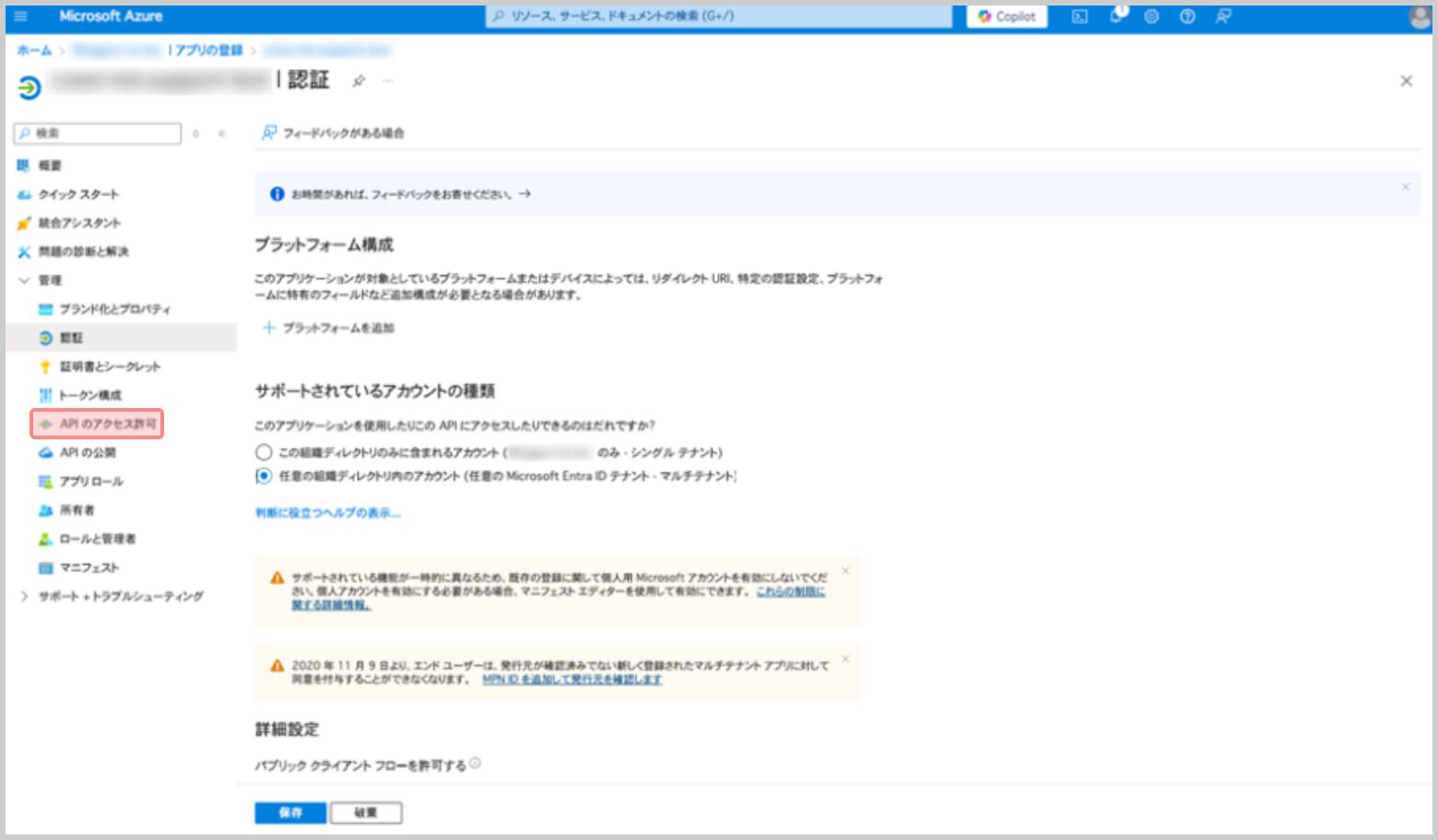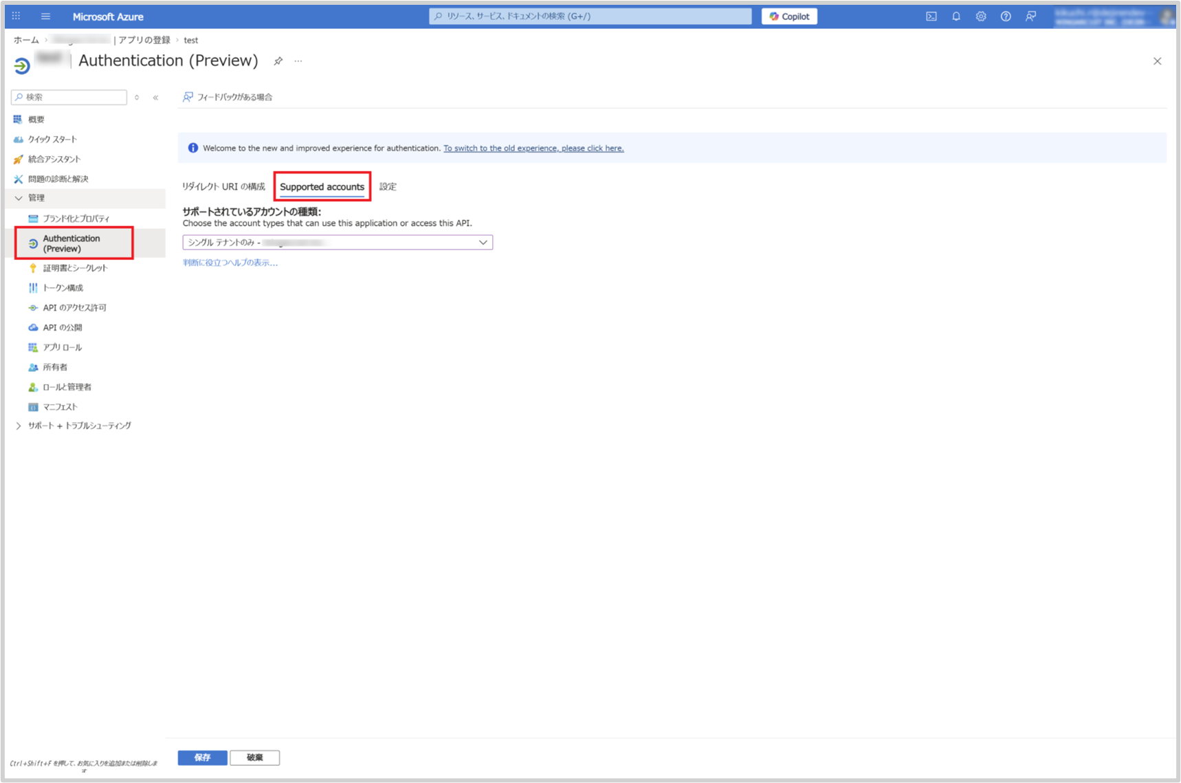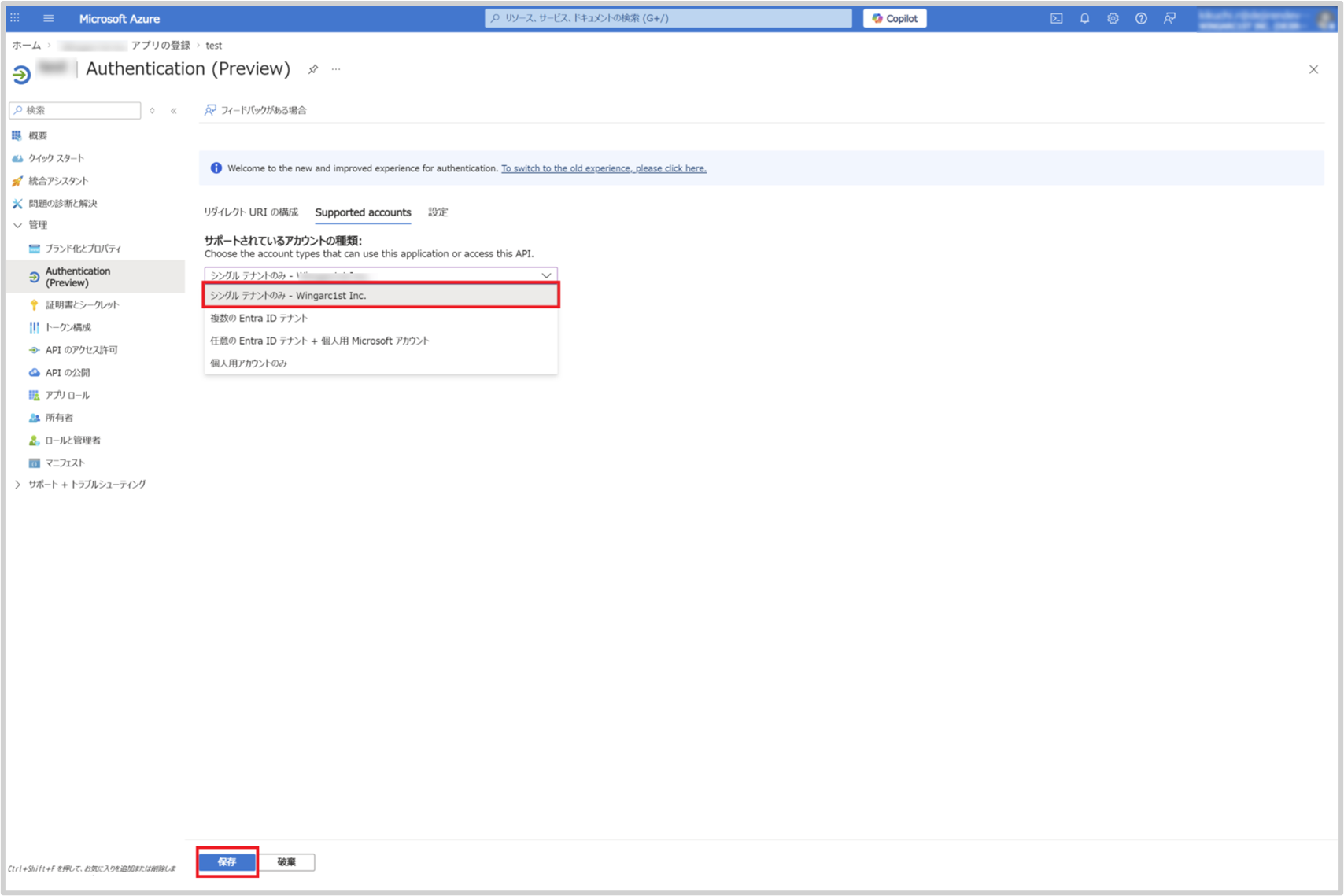 6.[サポートされているアカウントの種類]を[シングルテナントのみ]を選択し、保存します。