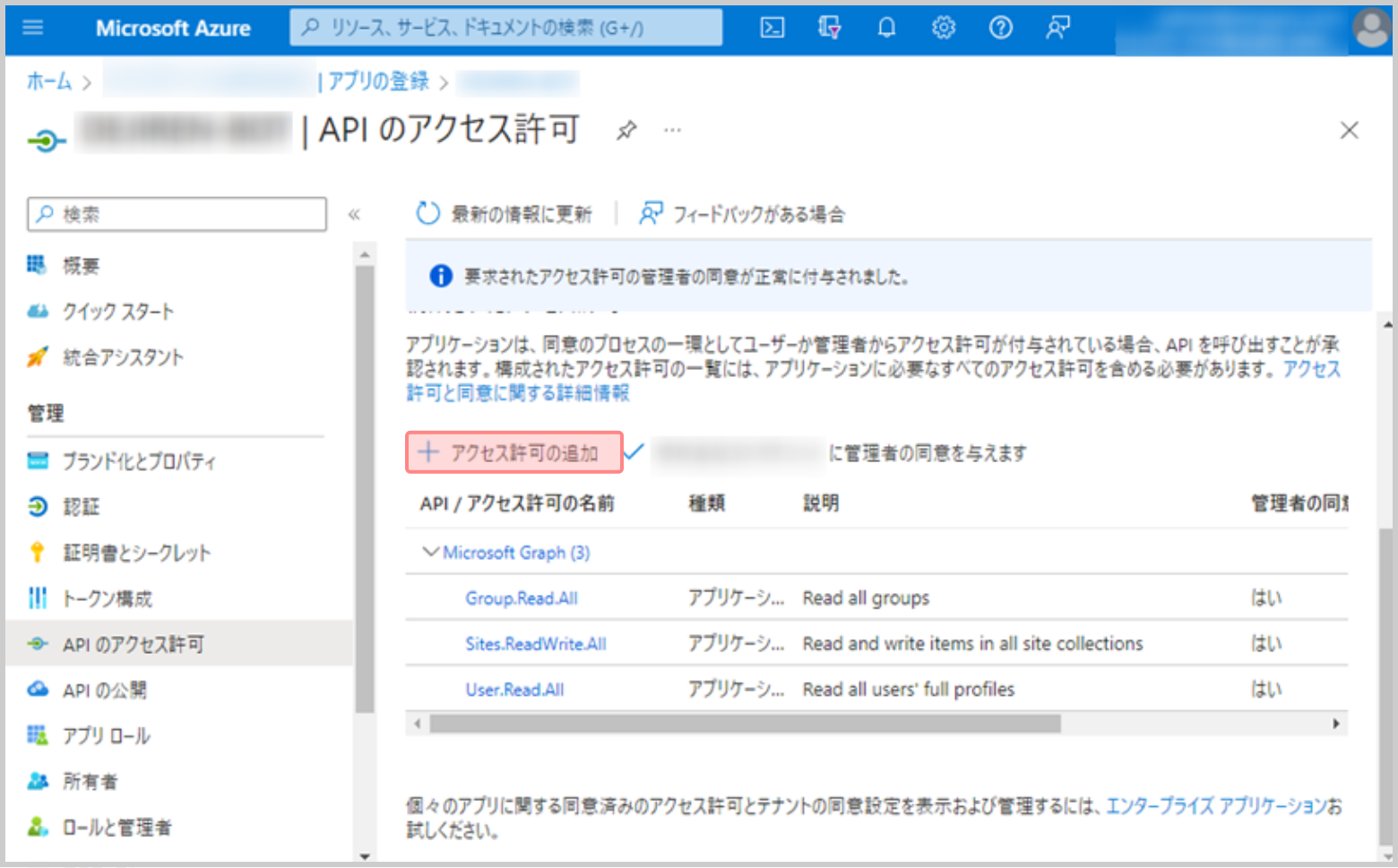 手順4.Microsoft Azure – Micorosoft EntraIDで、作成したアプリの許可設定を行う