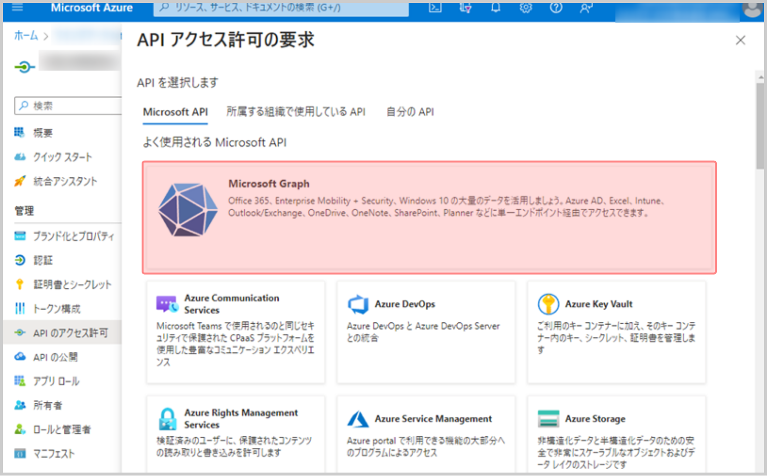 9.[API アクセス許可の要求]画面で[Microsoft Graph]をクリックします。
