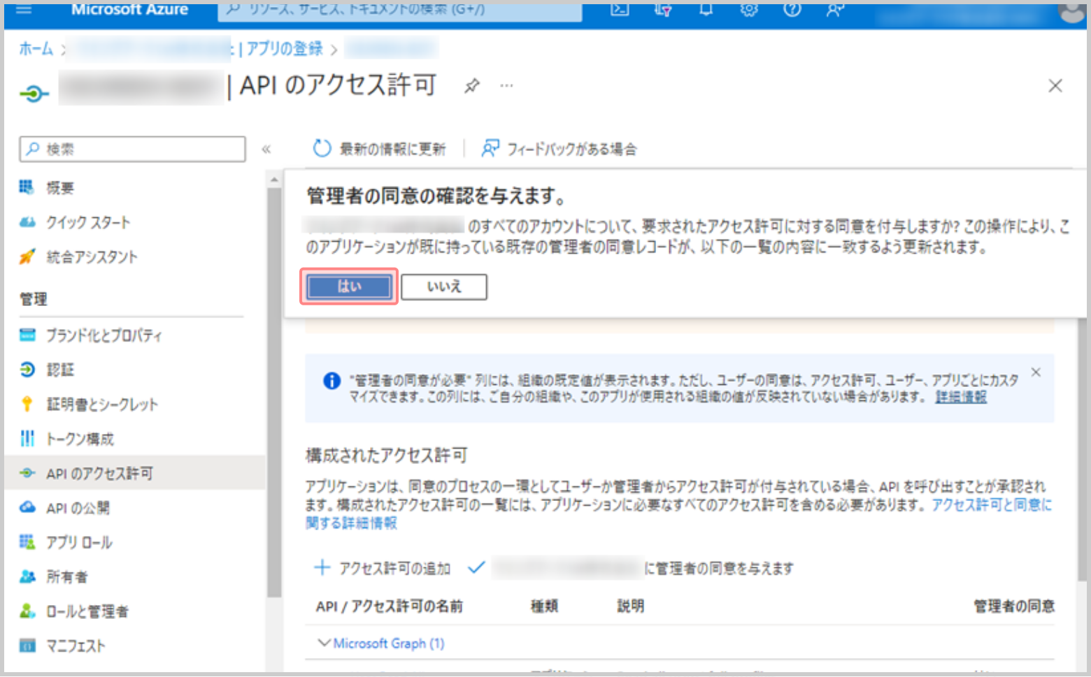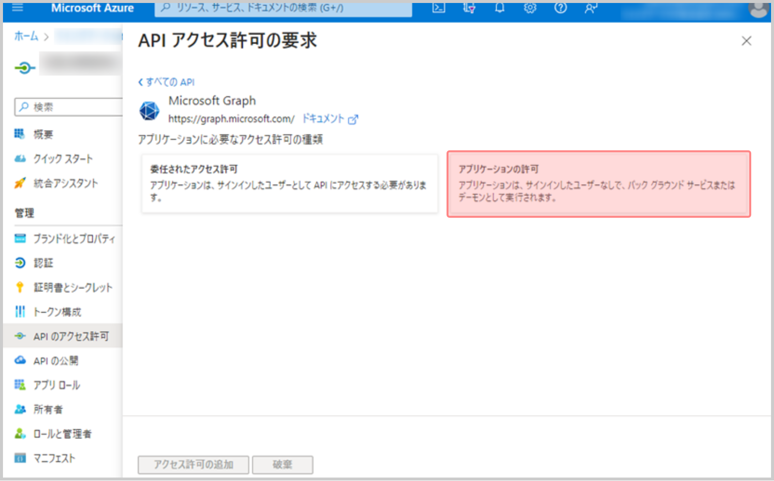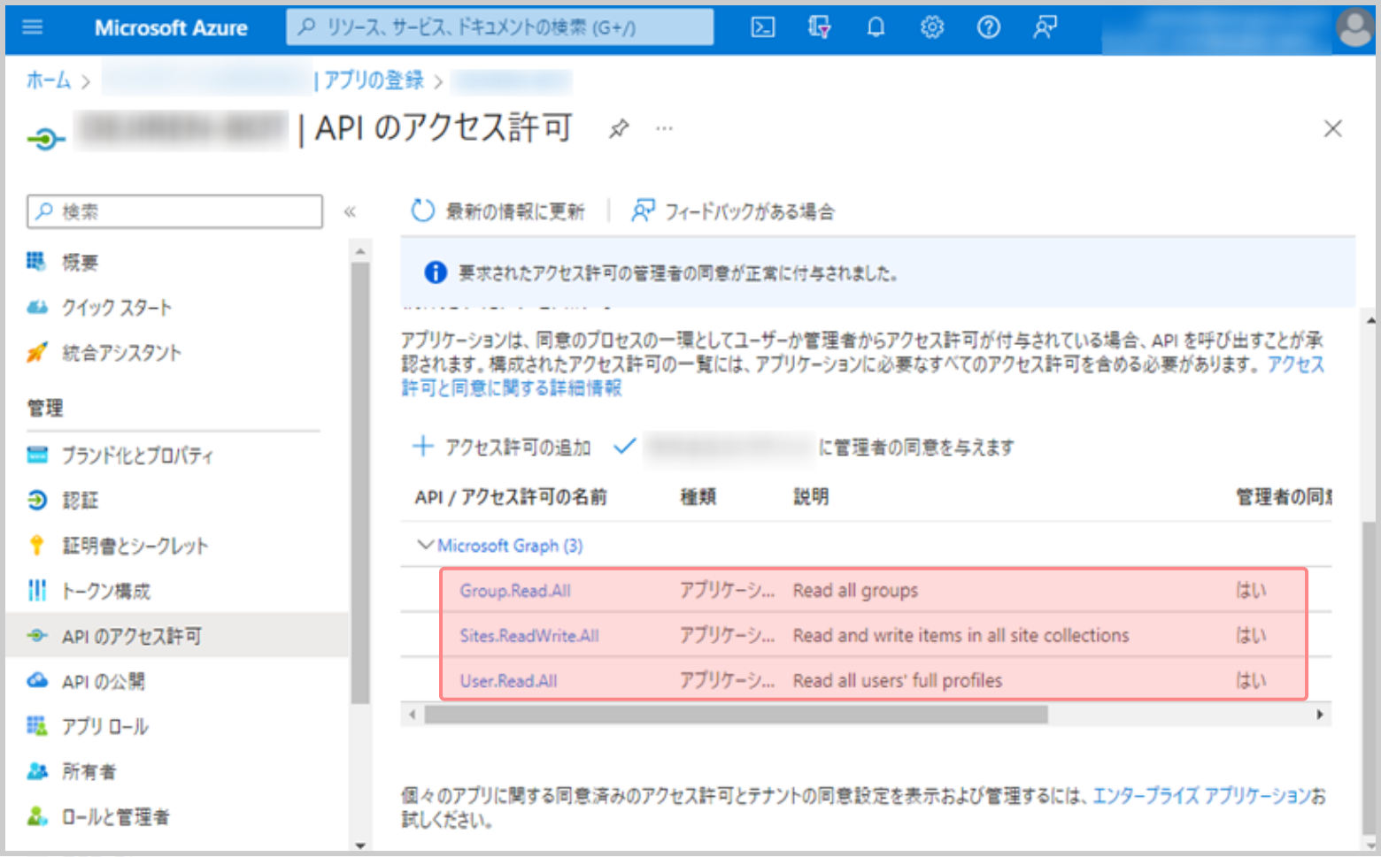 7.Microsoft Azure ポータルのサイドメニューの [APIのアクセス許可]をクリックします。