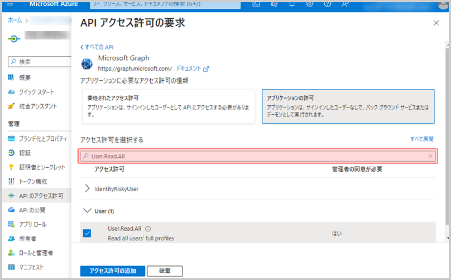 [User.Read.All]にチェックを付け、[アクセス許可の追加]をクリックします。