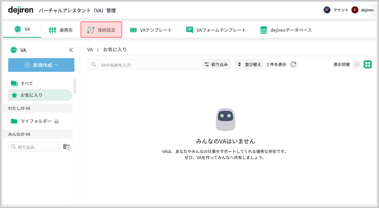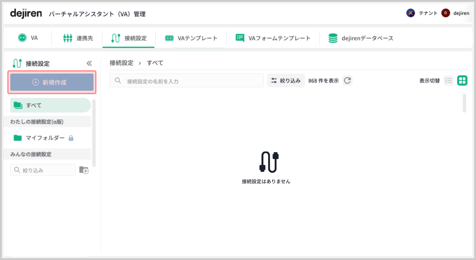 | dejiren | VA 編集権限 (VA 管理者、もしくはVA 編集者) | 接続設定の新設 |