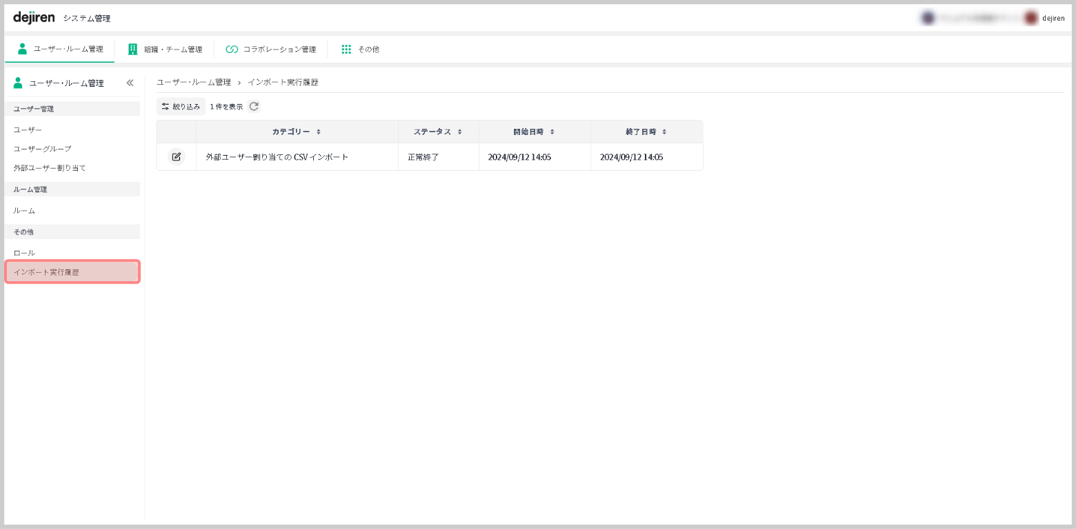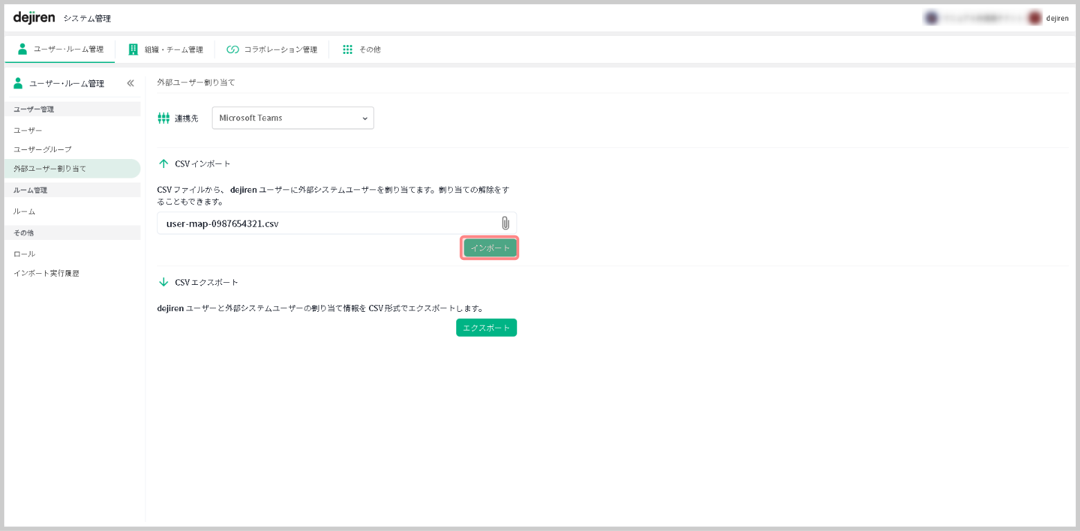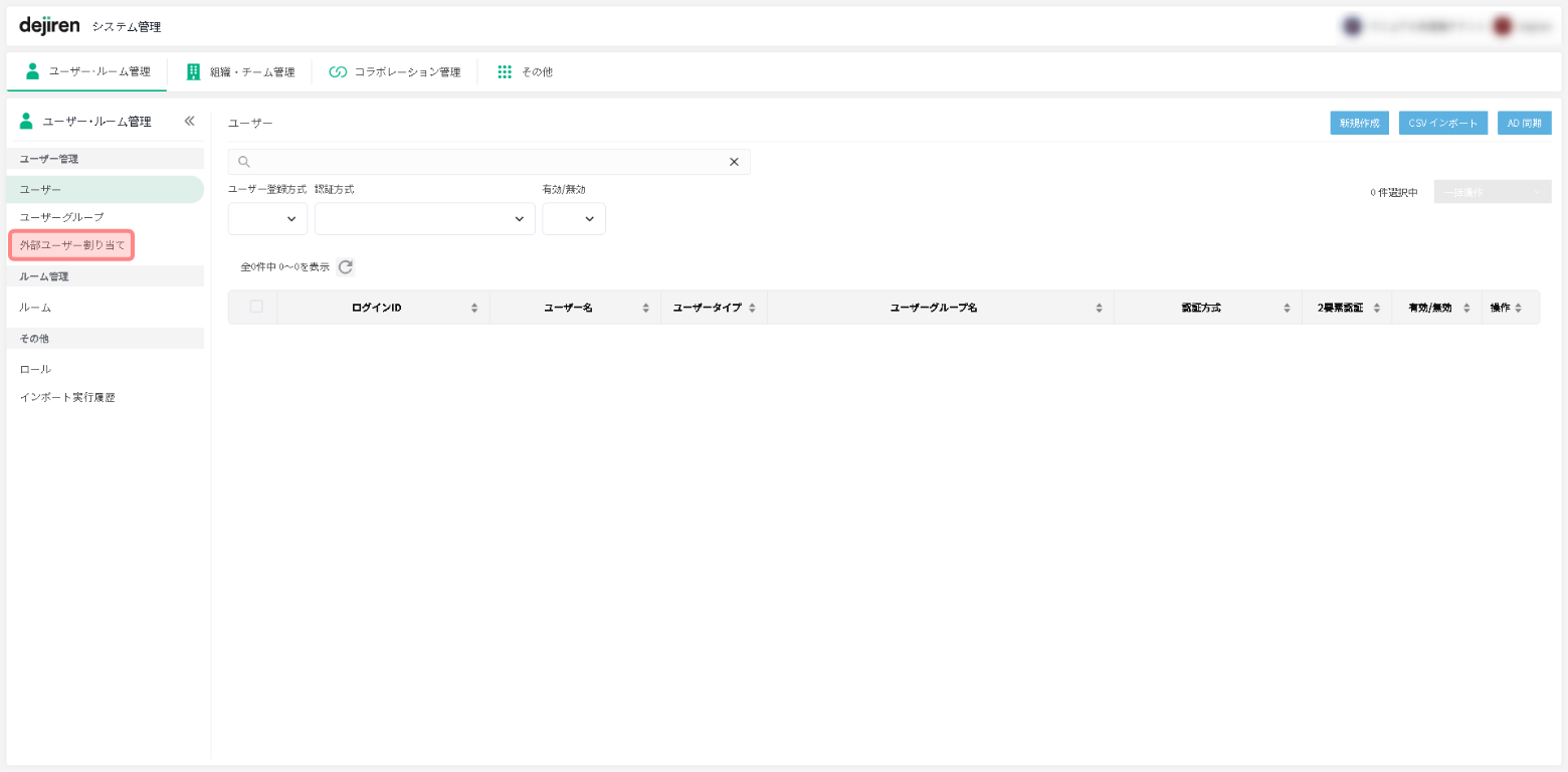 2.dejiren のシステム管理画面のサイドメニューにある[外部ユーザー割り当て]をクリックします。