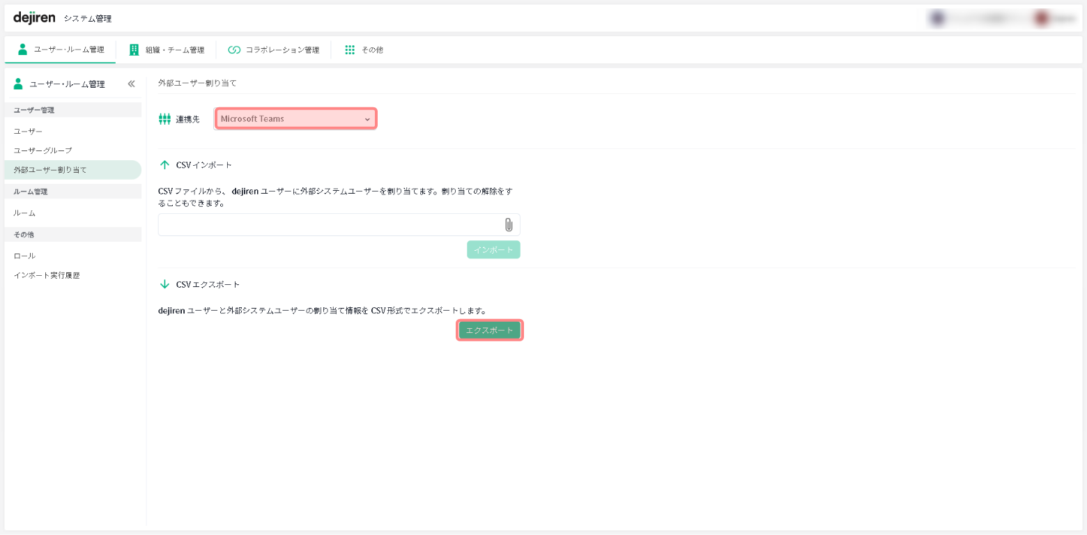 3.外部ユーザー割り当て]画面で、[連携先]から[Teams]を選択して、[エクスポート]をクリックします。