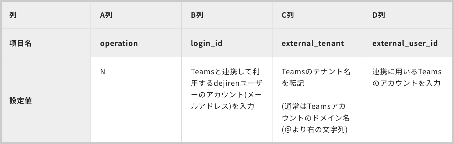 4.Microsoft Teams のアカウントと dejiren アカウントの結びつけを記載するためのCSVファイルを
