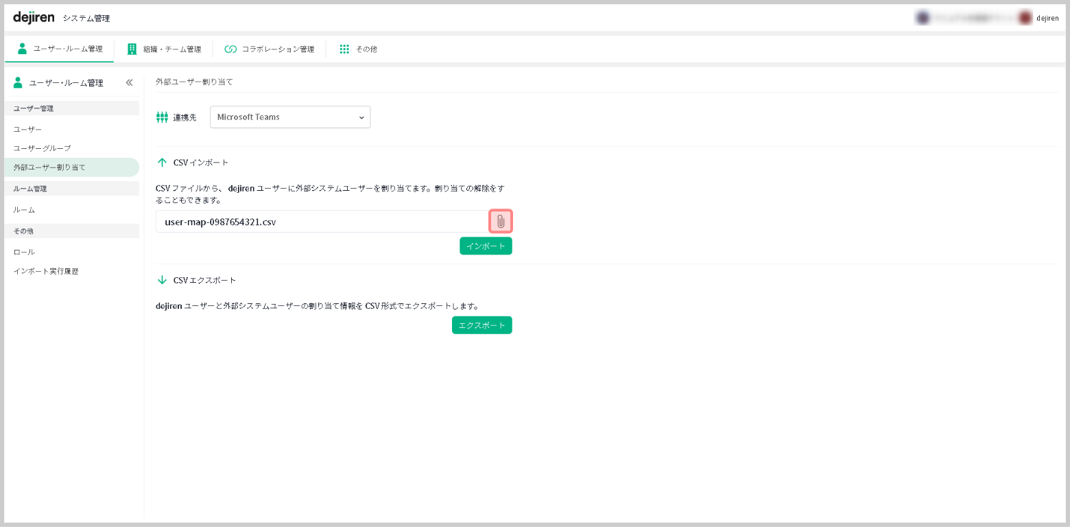 6.[外部ユーザー割り当て]画面の[ CSV インポート]セクションで、クリップマークをクリックして、