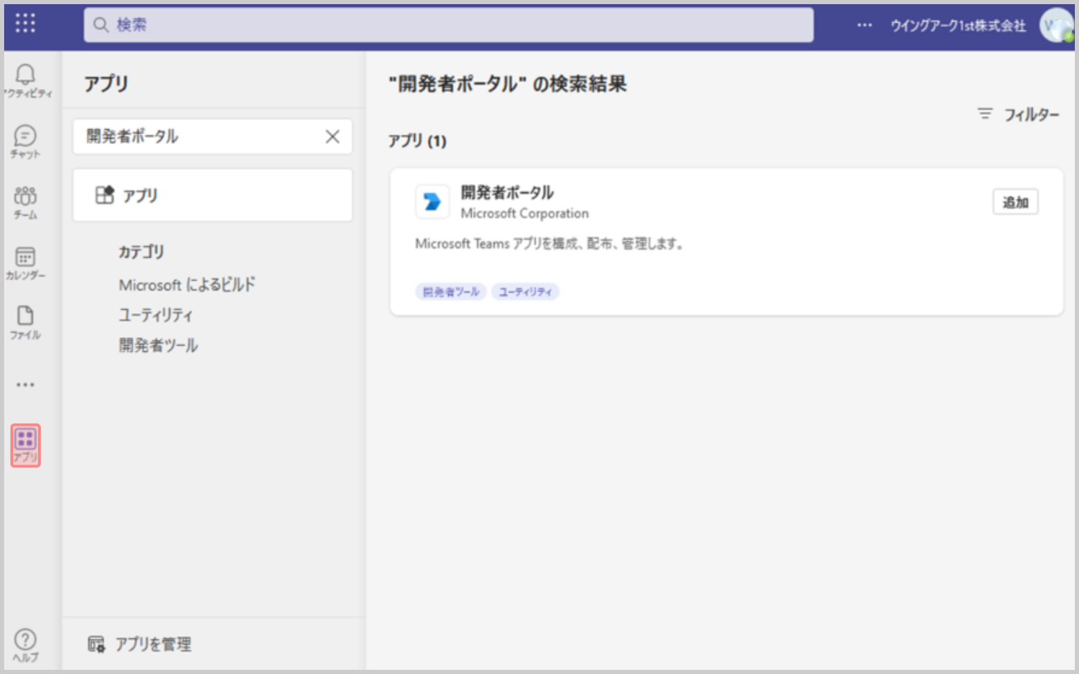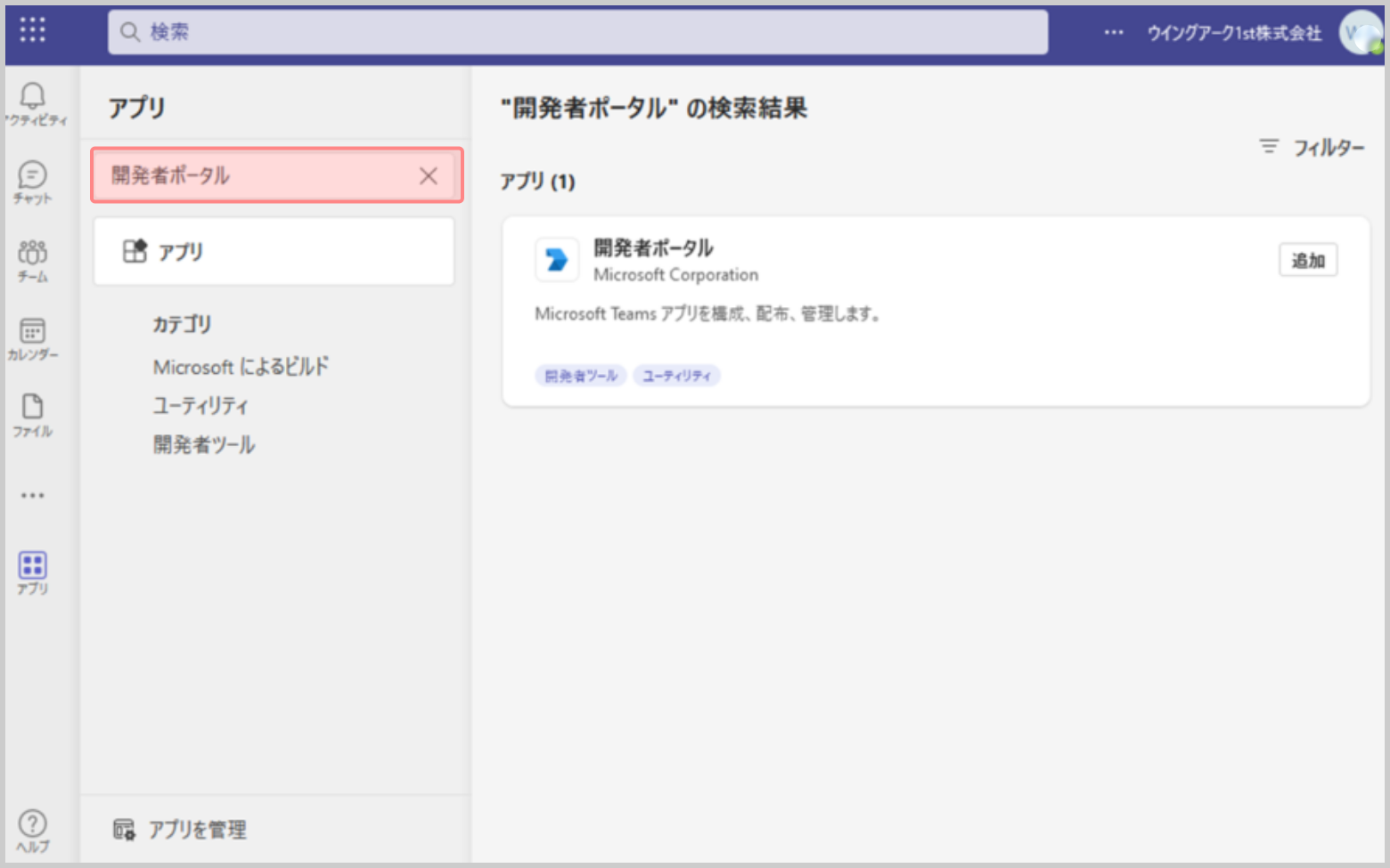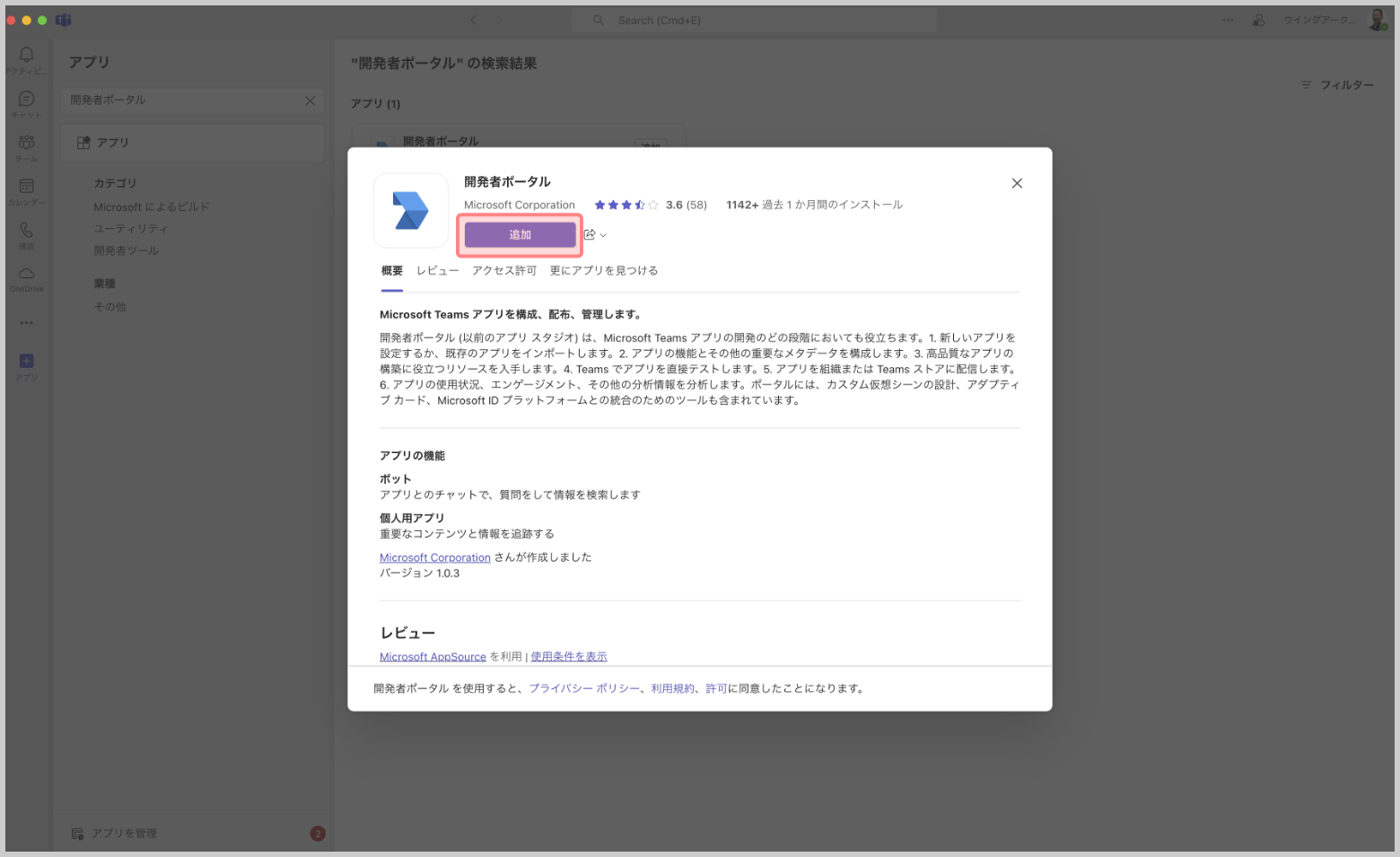 4.検索結果として表示された[開発者ポータル]の[追加]をクリックします。