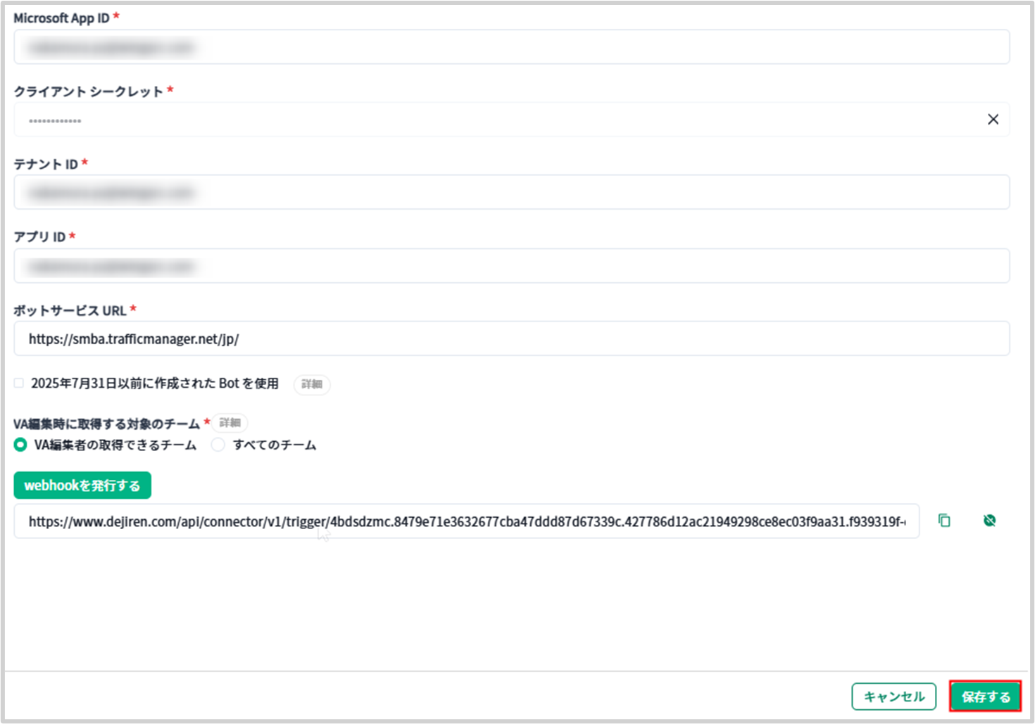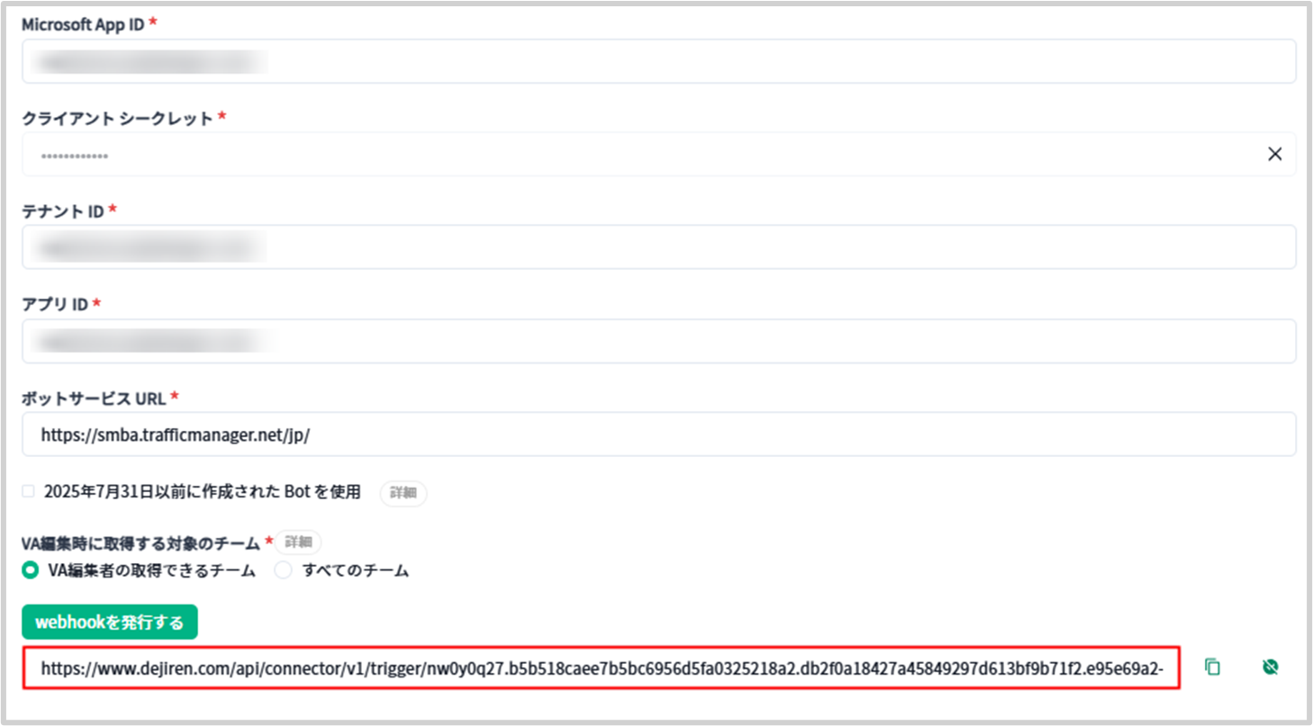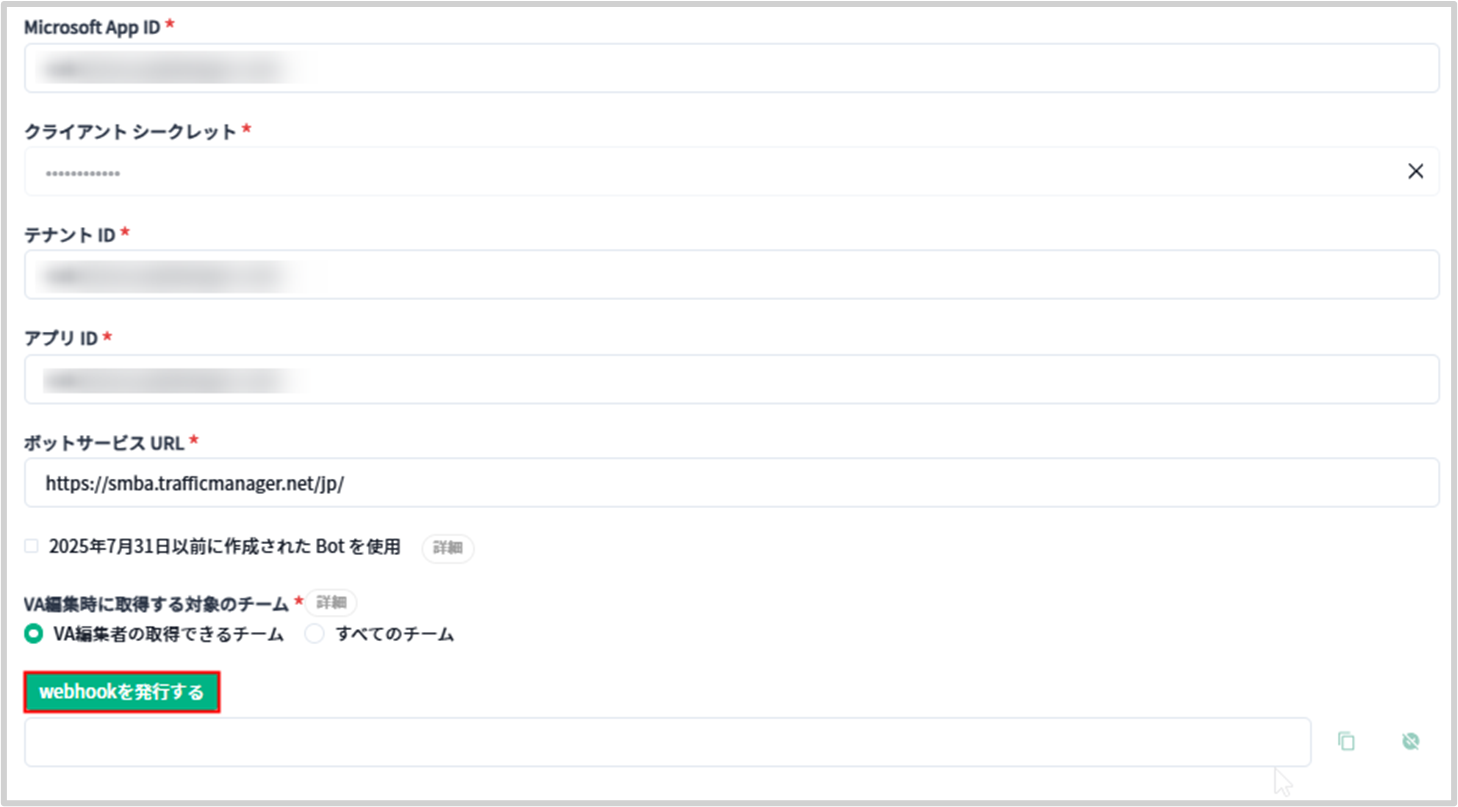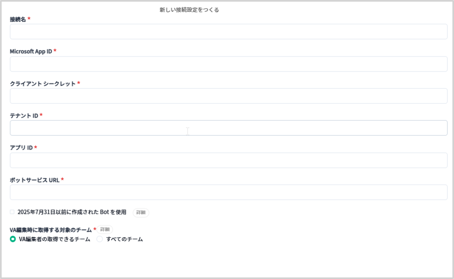 | 2025年7月31日以前に作成されたBotを使用 | 2025年7月31日以前に作成されたBotを使用する場合、チェックボックスをONに設定します。 | ー |