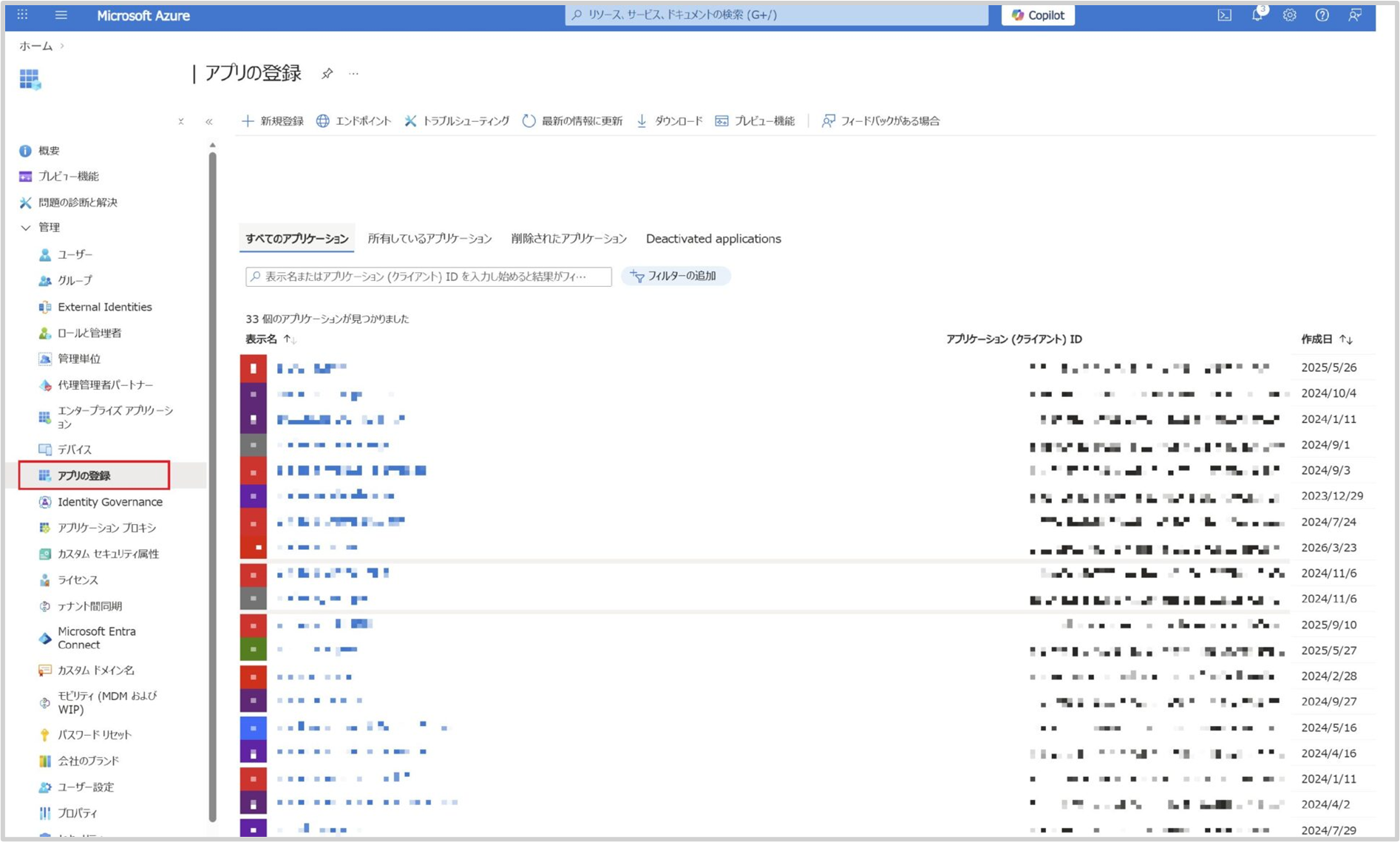 4.Microsoft Azure ポータルのサイドメニューの[アプリの登録]をクリックし、作成したアプリを選択します。