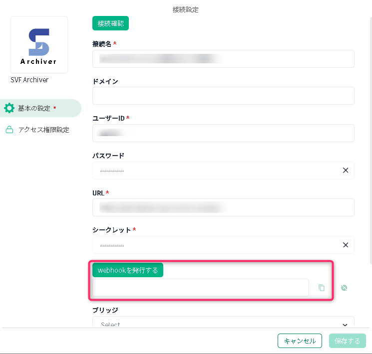 4. SVF Archiver 接続の設定画面で、[webhookを発行する]をクリックし、発行された文字列を控えます。