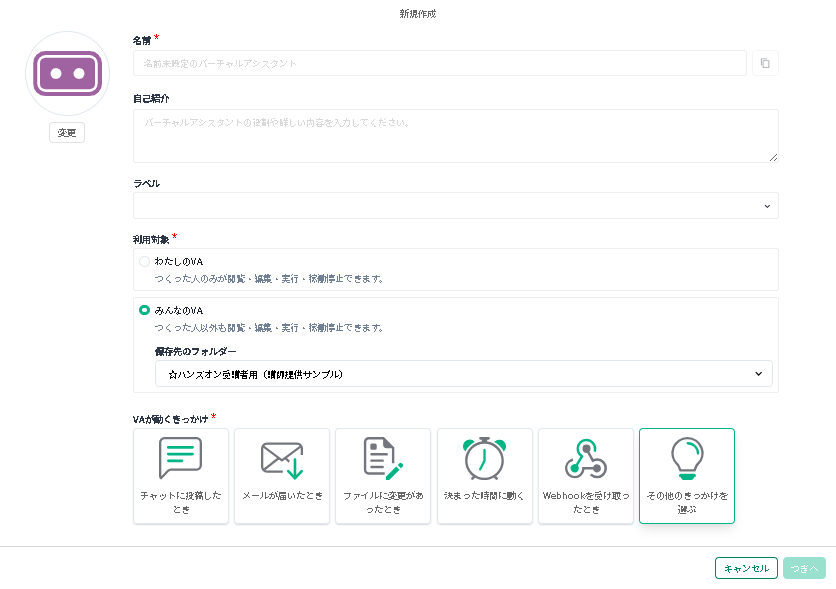 - 「VAが動くきっかけ」は「その他のきっかけを選ぶ」を選択して「つぎへ」をクリック、