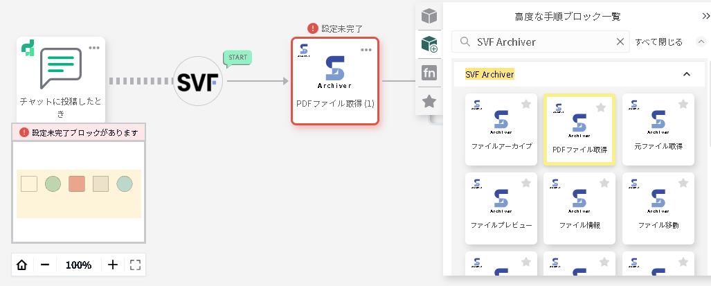 「高度な手順ブロック一覧」>「SVF Acrhiver」グループにある、