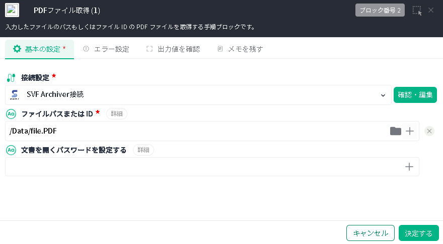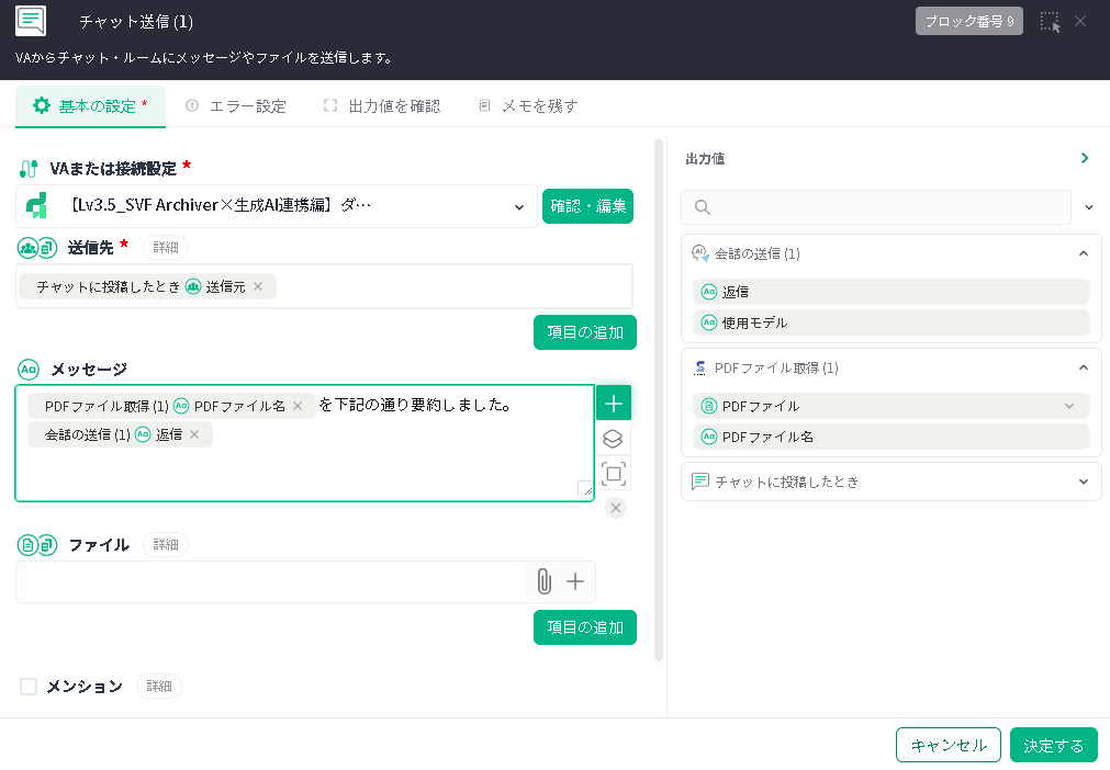| ファイルパスまたはID | フォルダアイコンをクリックして処理対象のファイルの格納パスを指定するか、ファイルIDを指定します。 | 今回の例では、特定のファイルを直接指定していますが、例えばチャット投稿された文字列情報を元に「ファイル検索」ブロックなどで検索し、該当ファイルを取得、という手順とすることも可能です。 |