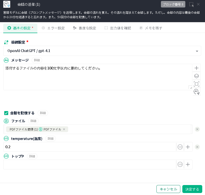 | ファイル | 「PDFファイル取得」で取得したファイルを指定します。 | このファイルが生成AIが解析する対象です。 |