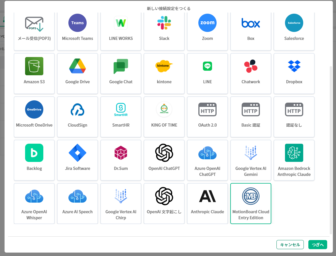 4. [新しい接続設定をつくる]で、[MotionBoard Cloud Entry Edition]をクリックで選択して[つぎへ]をクリックします。