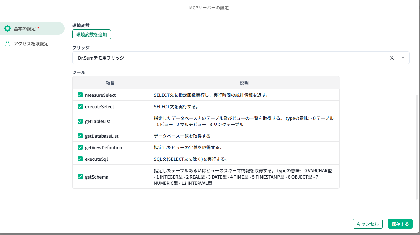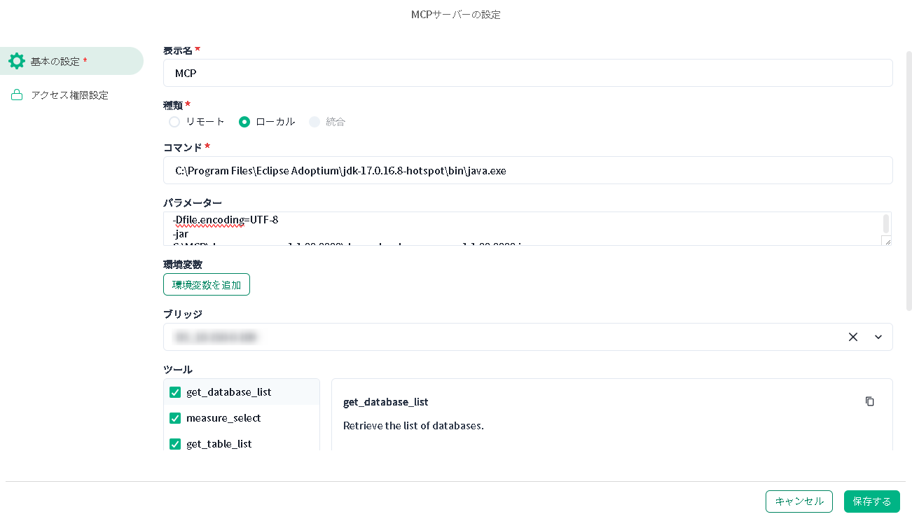 | ブリッジ | dejiren から、ローカルホストにあるリモート MCP サーバーに接続する場合に、アクセスするためのブリッジ接続設定を選択します。 | 必須 |