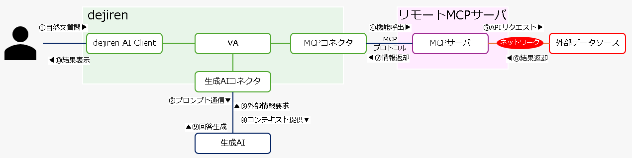 ・dejiren ではMCPサーバーに接続することで、様々な外部ツールやサービスをVA(仮想エージェント)から利用できるようになります。