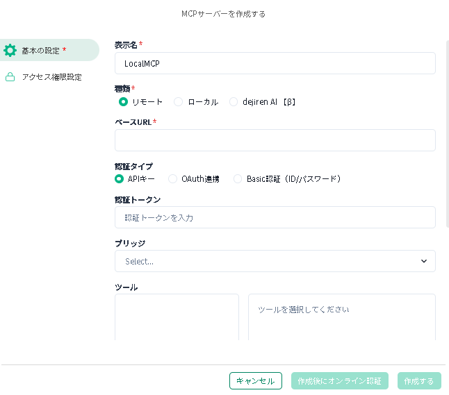 ブリッジの設定については、ブリッジサービスのご利用についてのページを参照してください。 - リモート MCP サーバーでブリッジを使用しない場合、dejiren から直接 HTTPS でアクセス可能なURL を指定してください。