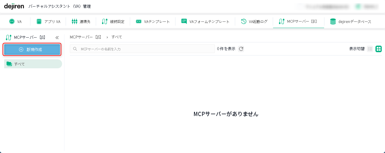 3. 「MCP サーバー」画面で「新規作成」をクリックします。
